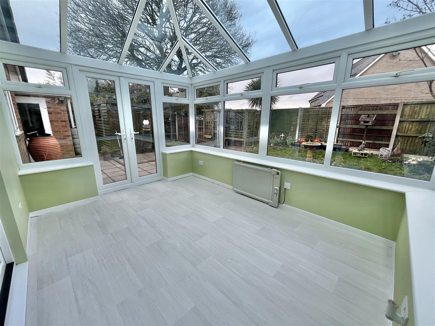 Fully double glazed. Electric radiator. Double glazed double doors to garden.