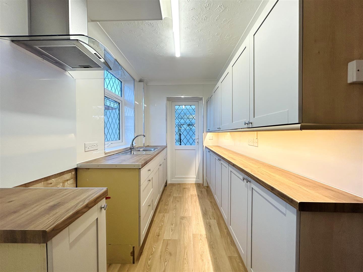 Refurbished kitchen comprising of Cupboard's at both eye and floor level. New LED under unit lighting to one side of Kitchen. Space for freestanding cooker, new extractor hood above, space for fridge. New double glazed diamond leaded windows to side. New UPVC diamond leaded double glazed door to;