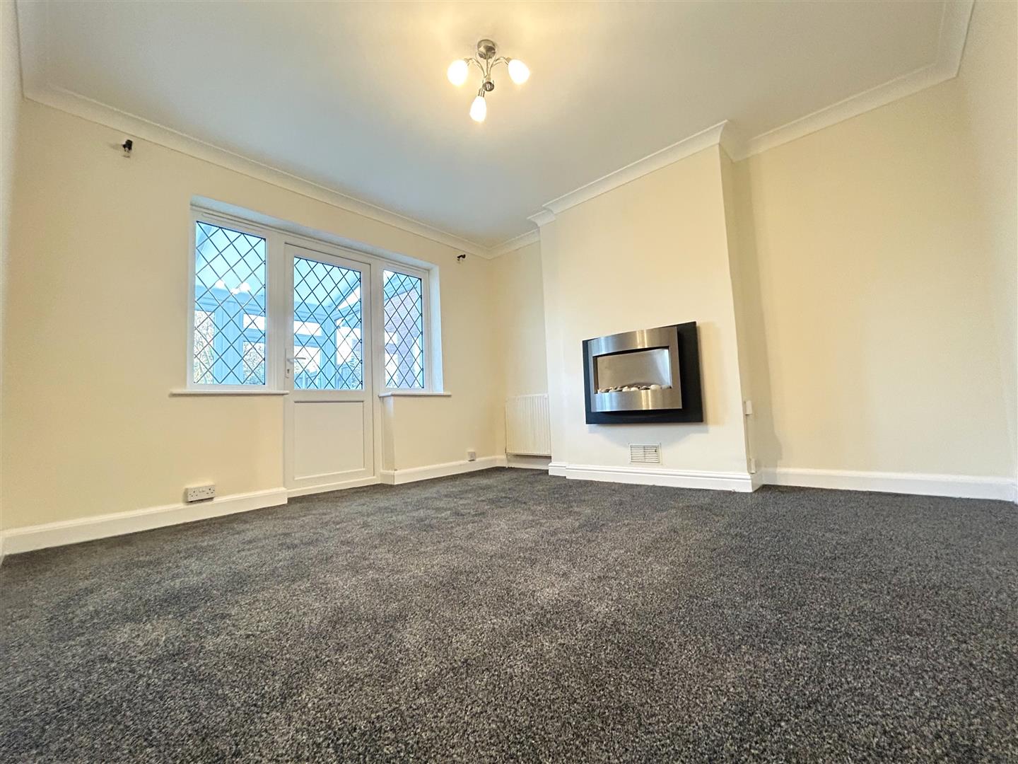 Wall mounted electric fire feature surround. Radiator. New UPVC diamond leaded double glazed door and diamond leaded sidelights to conservatory.