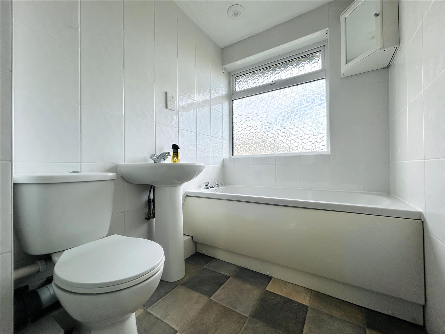 Panelled enclose bath, shower cubicle with thermostatic power shower above. Low level W.C. Hand wash basin pedestal. Fully tiled walls. Double glazed window to rear.