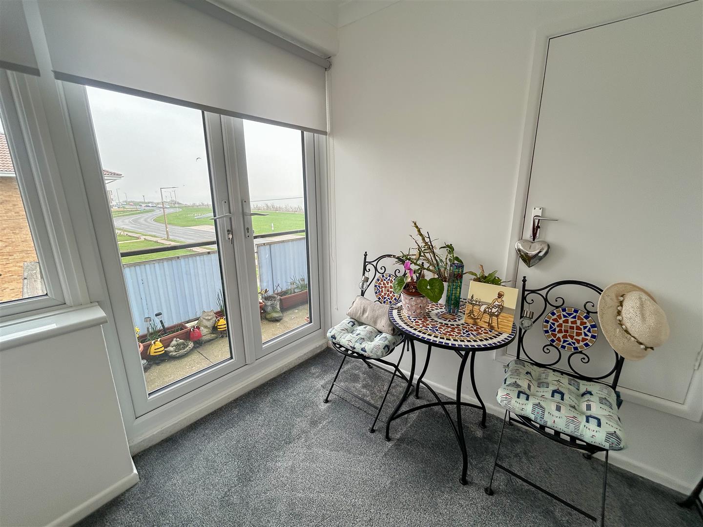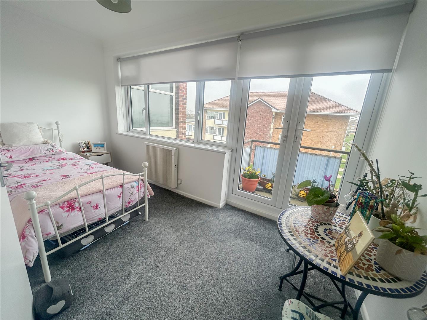 Storage cupboard. Electric heater (not tested). Double glazed window to side. Doors leading to balcony.