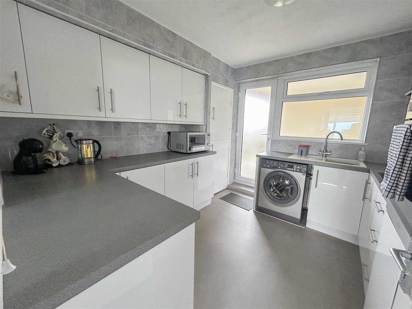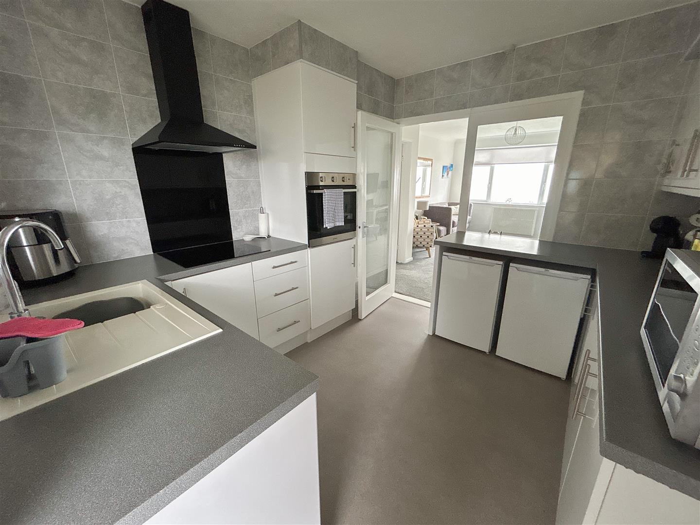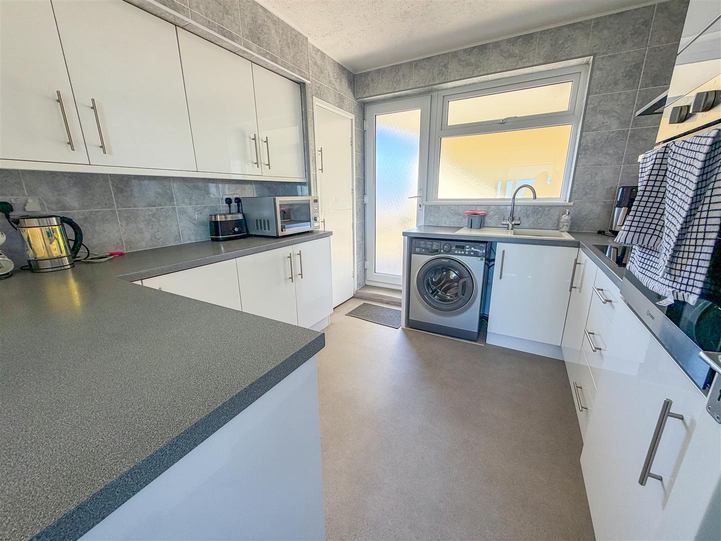 Fitted with a range of a selection of wall mounted white gloss fronted units. Comprising; rolled edge work surfaces with cupboards and drawers below. Inset sink unit with mixer tap. Integrated electric oven (not tested). Electric four ring hob with extractor fan above (not tested). Space for under counter fridge and under counter freezer. Space and plumbing for washing machine. Storage cupboard. Double glazed window to rear. Doors leading to stair flight down too communal gardens and allocated parking space.