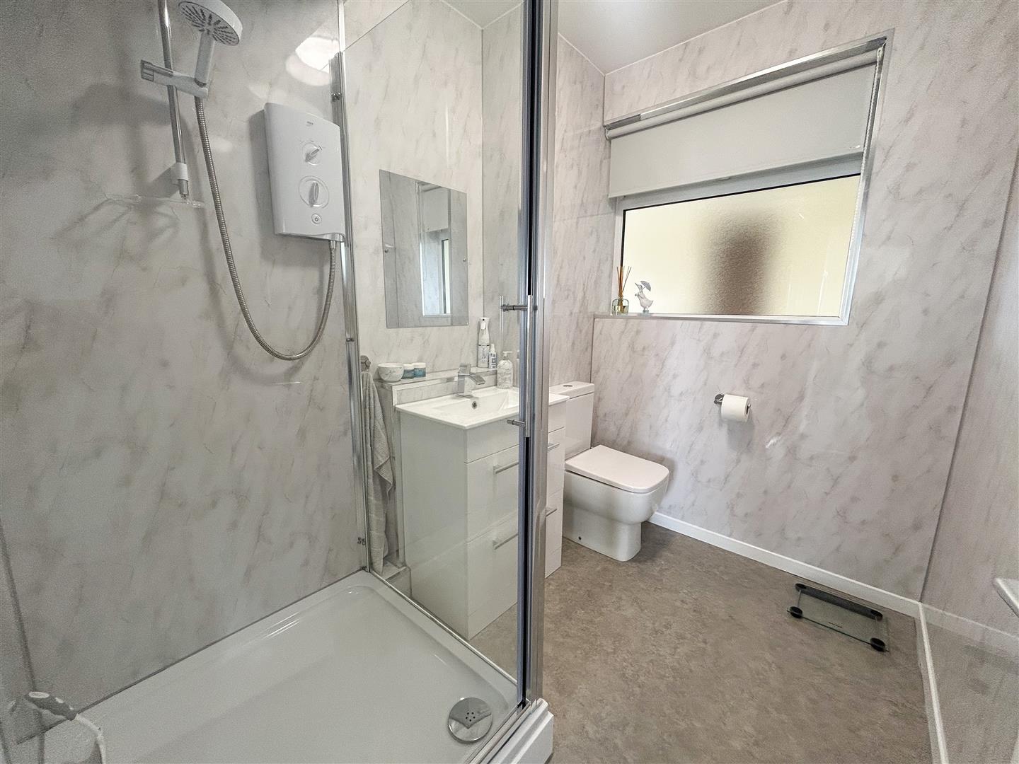 Low level W/C. Vanity hand wash basin with mixer tap. Shower cubical with wall mounted shower attachment (not tested). Double glazed window to front.