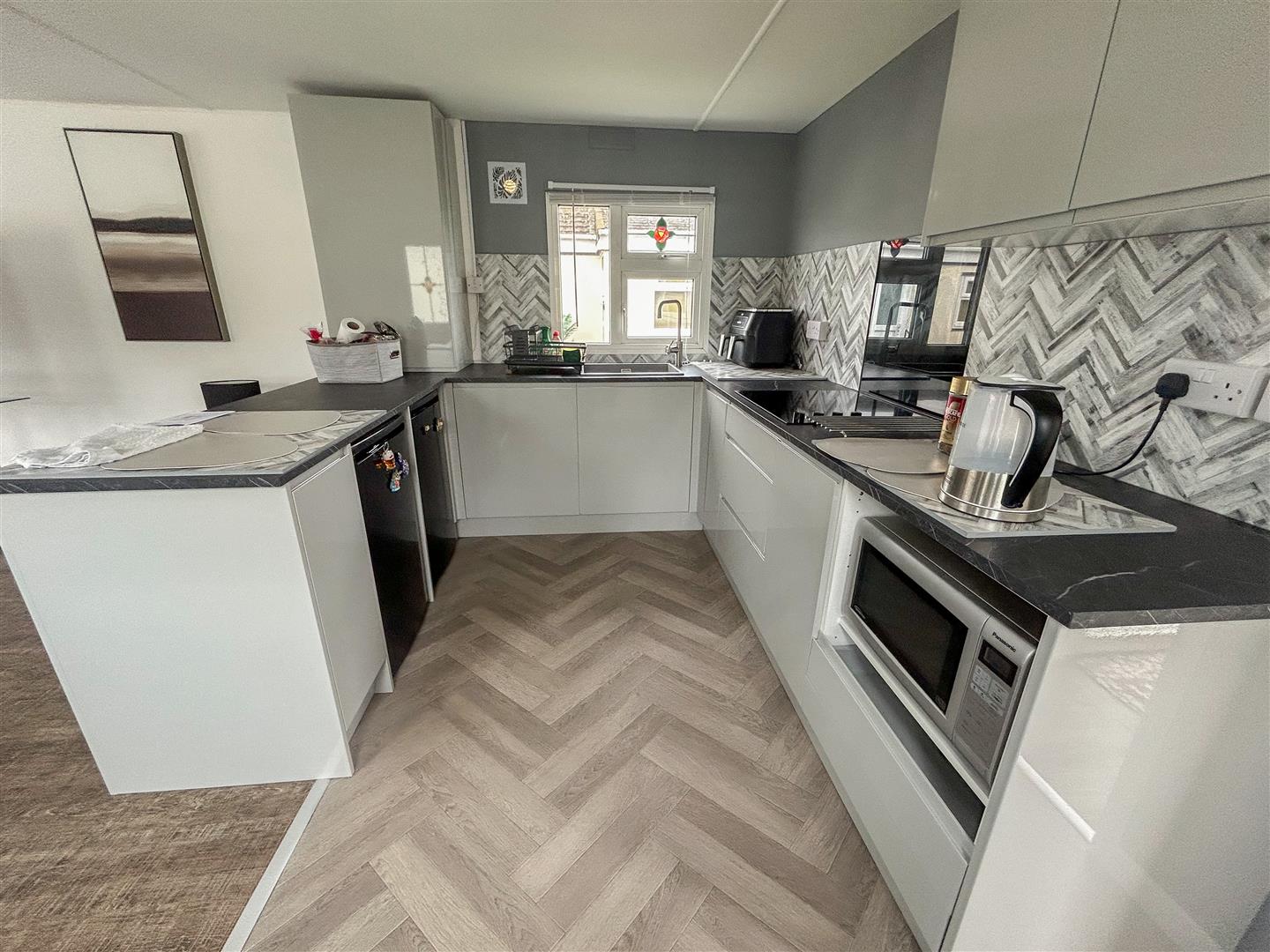 Fitted with a range of grey gloss fronted units. Comprising; rolled edge work surfaces with cupboards and drawers below. Inset sink unit with mixer tap. Space for under counter fridge and freezer. Electric hob (not tested). Cupboard housing wall mounted gas combination boiler (not tested). Double glazed window to side.