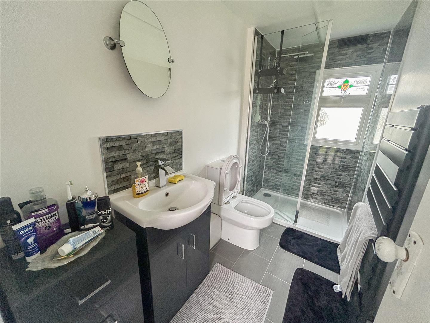 Low level W/C. Shower cubical with wall mounted shower attachment (not tested). Vanity hand wash basin with mixer tap. Heated towel rail (not tested). Double glazed window to side.