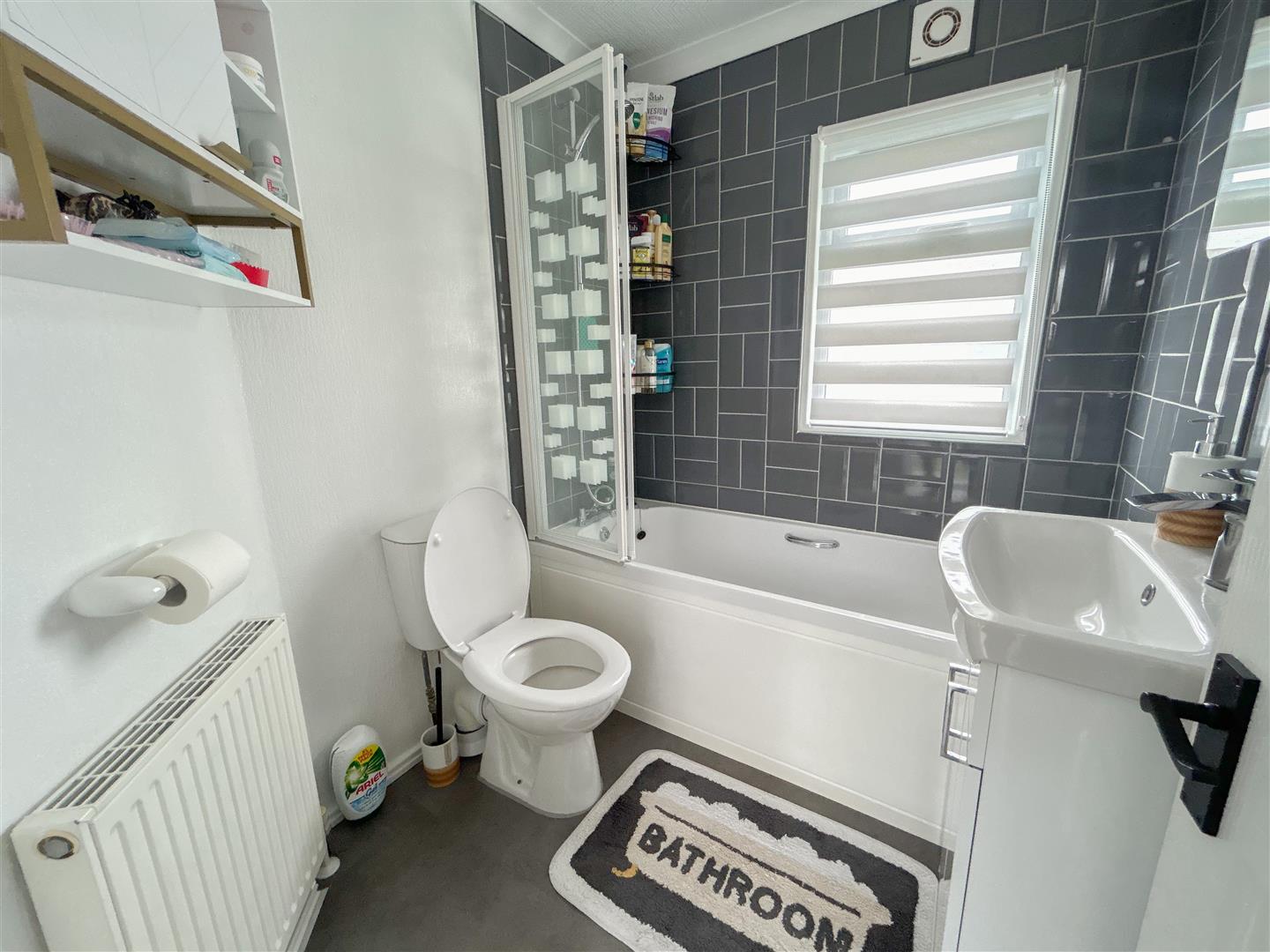 White suite comprising of; Low level W.C. Vanity hand wash basin with cupboards under. Independent shower cubicle with wall mounted electric shower (not tested). Radiator. Part panelled walls. Double glazed window to side.