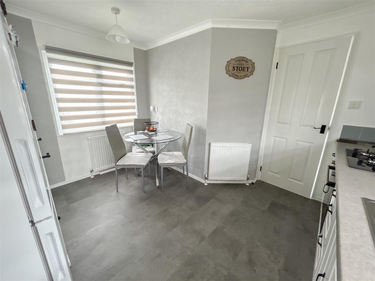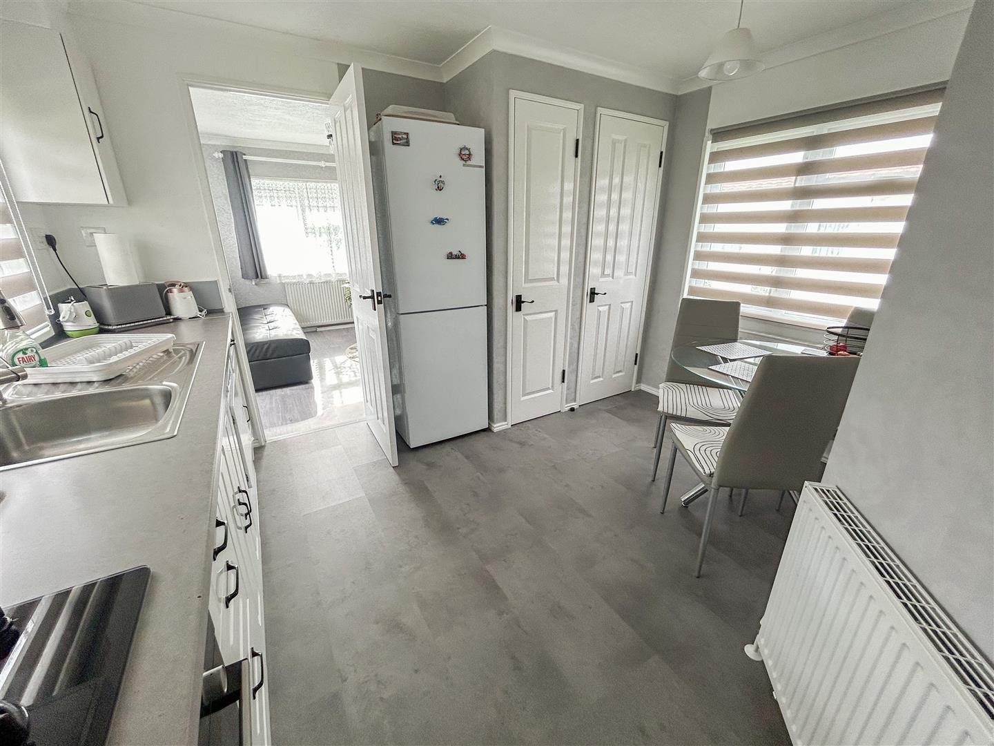 Laminated rolled edge work surfaces with inset one and a half bowl single drainer stainless steel sink unit. Plumbing and space for cooker and fridge freezer. Selection of matching cupboards and drawers at both eye and floor level. Storage cupboard housing wall mounted gas boiler (not tested). Radiator. Double glazed window to both side aspects. Open access to;