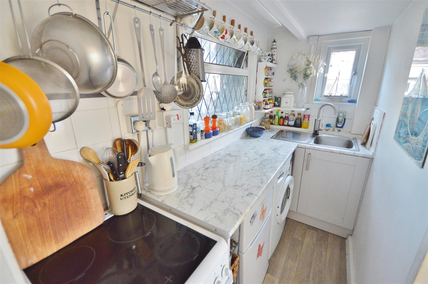 Fitted kitchen suite comprising laminated rolled edge work surfaces with inset single drainer stainless steel sink unit with a stainless steel electric tap. Space for cooker. Space and plumbing for washing machine. Space for fridge or freezer. Under sink storage cupboard. Double glazed windows to front and side. Sliding door to: