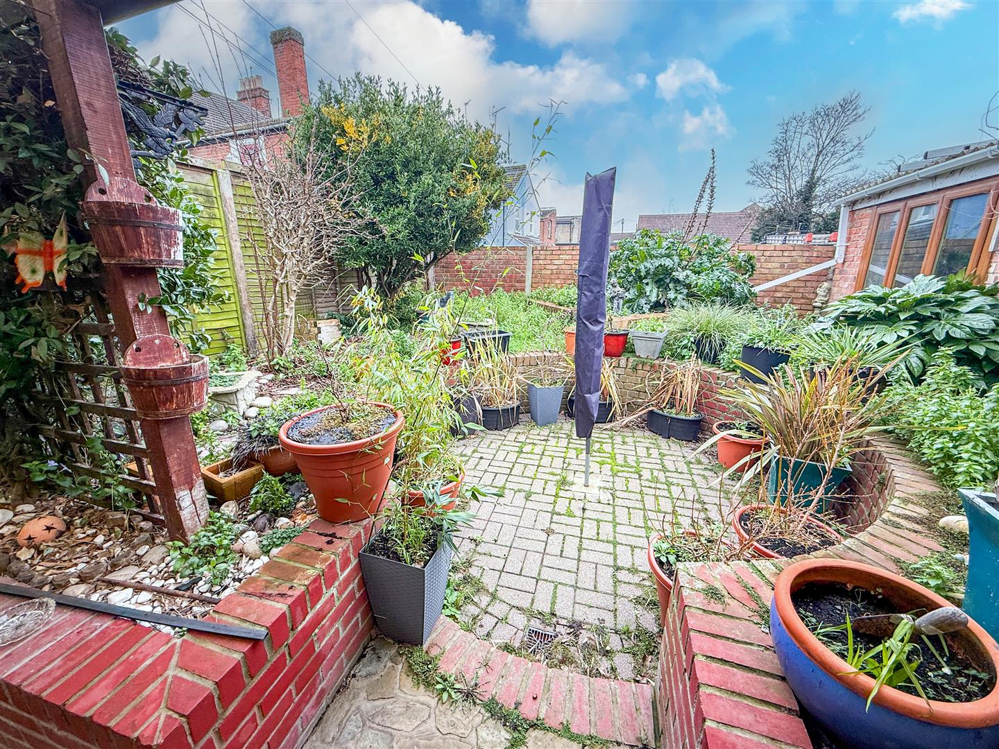Landscaped rear garden which has raised brick flower beds and ornamental fish ponds. Additional circular block paved patio area enclosed by circular raised flower beds. Part enclosed by brick wall and panelled fencing. Additional door leads to cupboard. Side access leading to the access for Empire Mews.