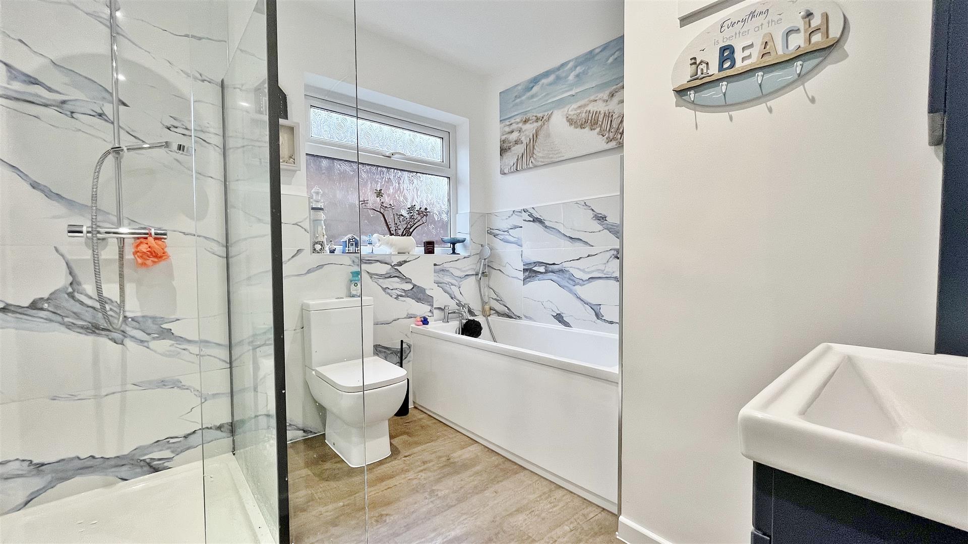 Modern suite comprises of low level w/c. Fitted panelled bath. Walk-in fitted shower cubical with wall mounted shower attachment. Vanity hand wash basin with storage cupboard under. Heated towel rail. Tiled splash back. Wood effect laminate flooring. Spotlights. Extractor fan. Obscured sealed unit double glazed window to side.