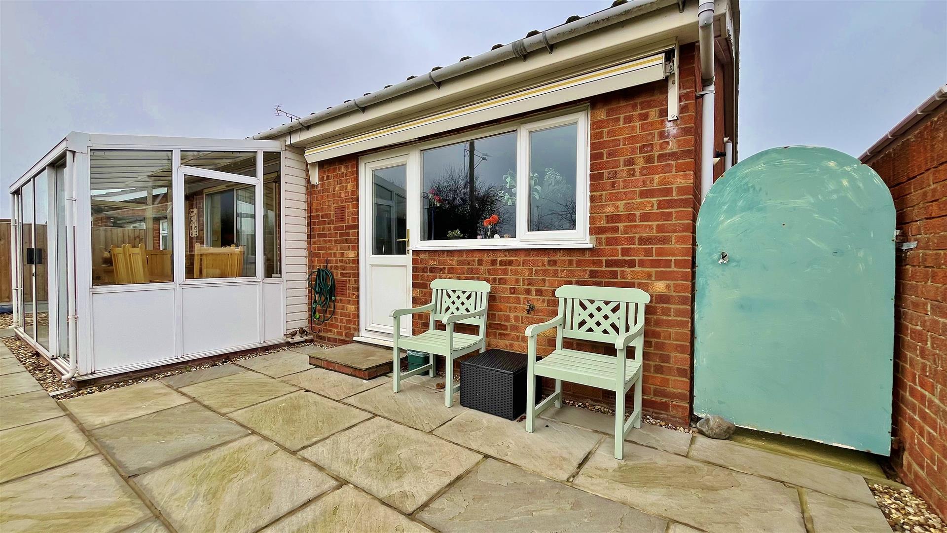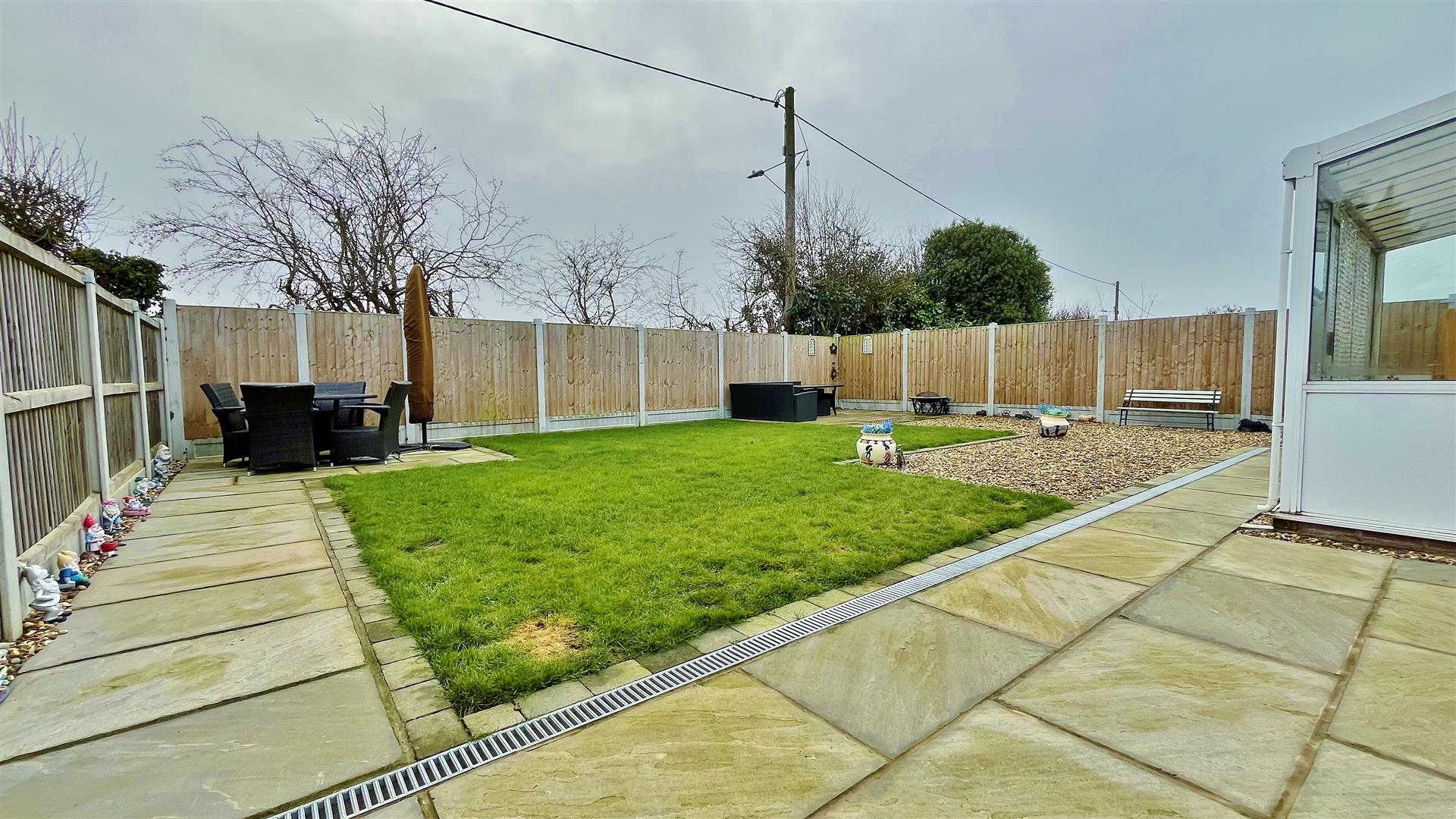 South west facing. Part paved patio area. Part shingled area. Remainder laid to lawn. Access to front via side gate. Private access door to office. Outside tap. Enclosed by panelled fencing.