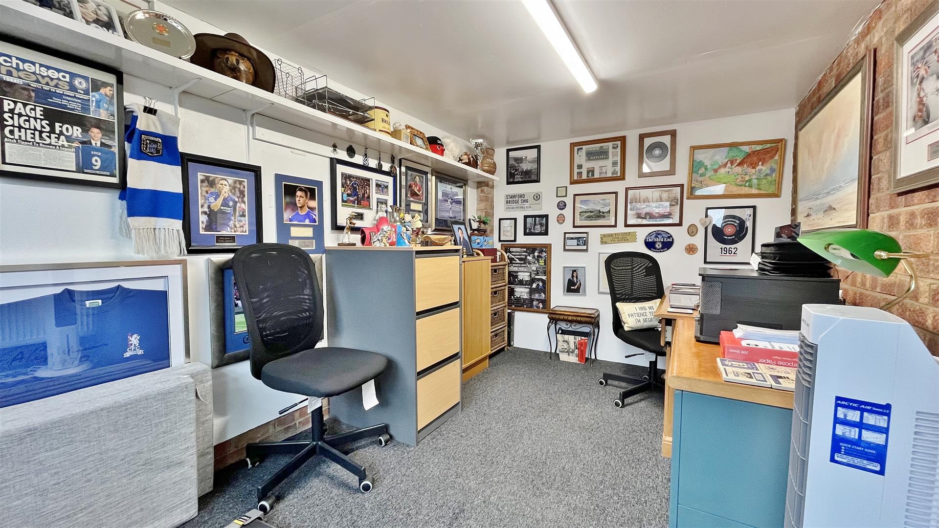 Hardstanding concrete area providing off street parking leading to garage with electric roller door. Power and light connected. Remainder laid to shingle. Pathway leading to entrance door.