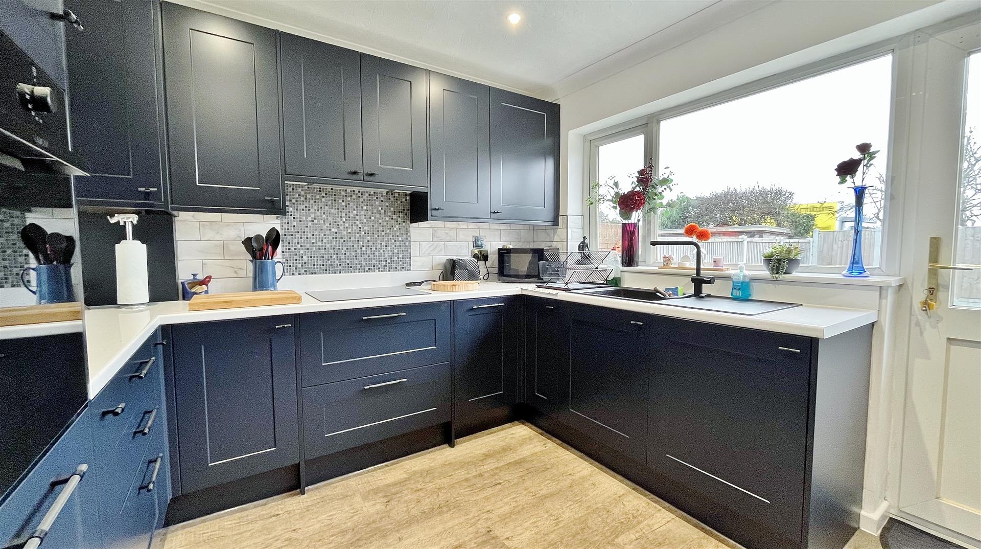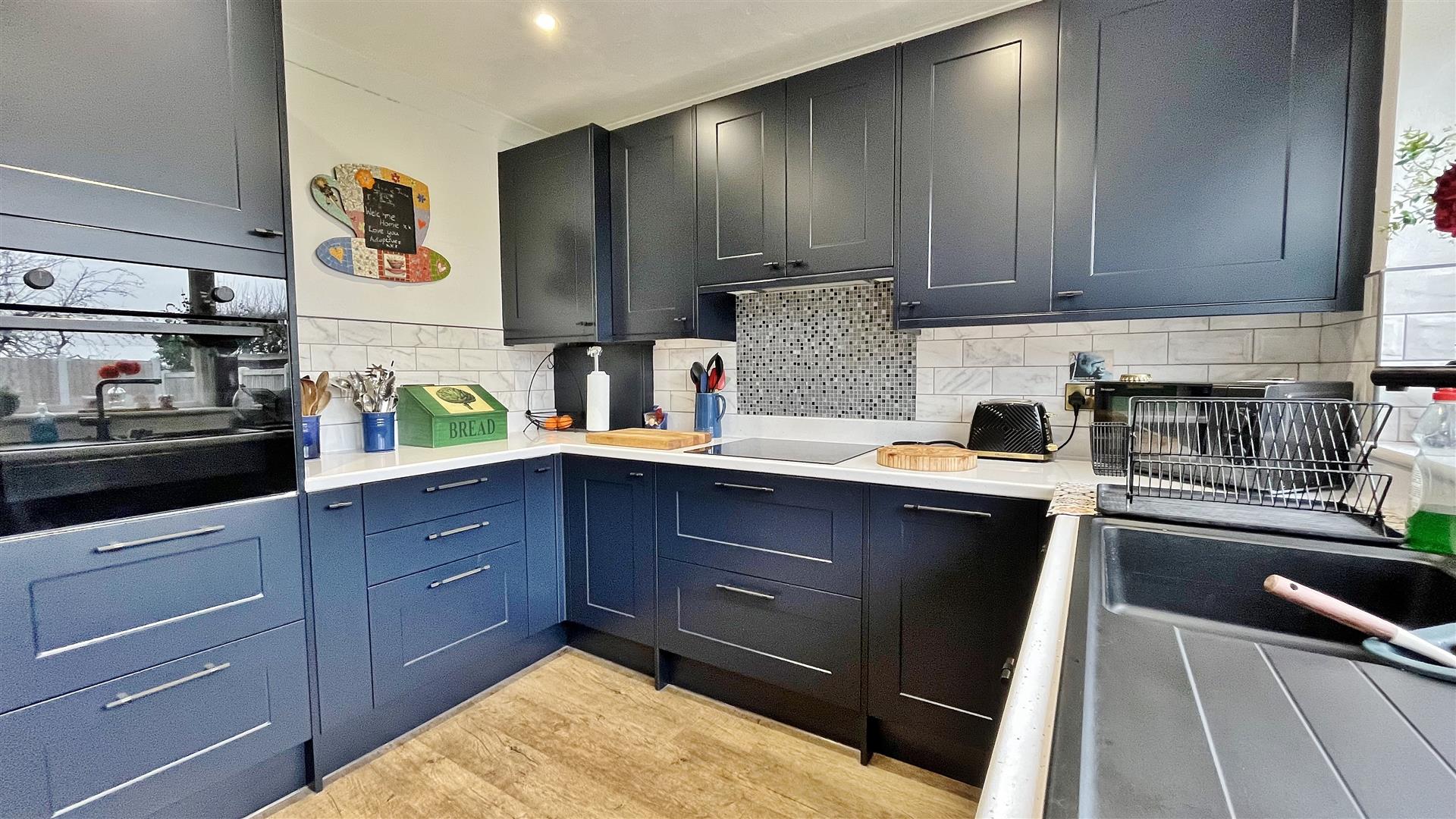 Fitted in a range of matching fronted units. Fitted rolled edge work surfaces. Inset ceramic sink bowl and drainer unit. Inset four ring induction hob with extractor fan above. Built in eye level electric oven. Further range of matching fronted units both eye and floor level. Integrated dishwasher, washing machine and fridge/freezer. Cupboard housing combination boiler. Tiled splash back. Radiator. Wood effect laminate flooring. Built in storage cupboard. Spotlights. Sealed unit double glazed window to garden. Sealed unit double glazed door to garden.