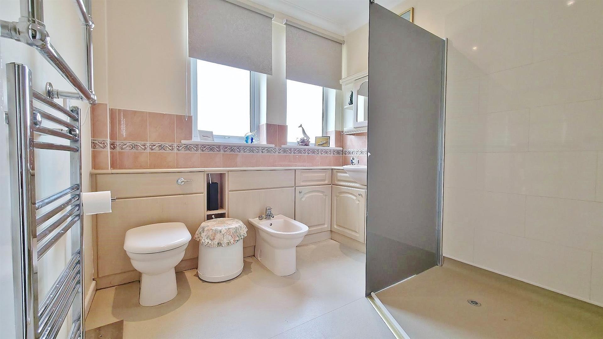 Suite comprising of low level W/C with concealed cistern. Vanity wash hand basin with storage cupboards under. Bidet. Wall mounted electric shower with fitted glass shower screen and soak away. Part tiled walls. Fitted extractor fan. Heated towel rail. Two obscured sealed unit double glazed windows to front.