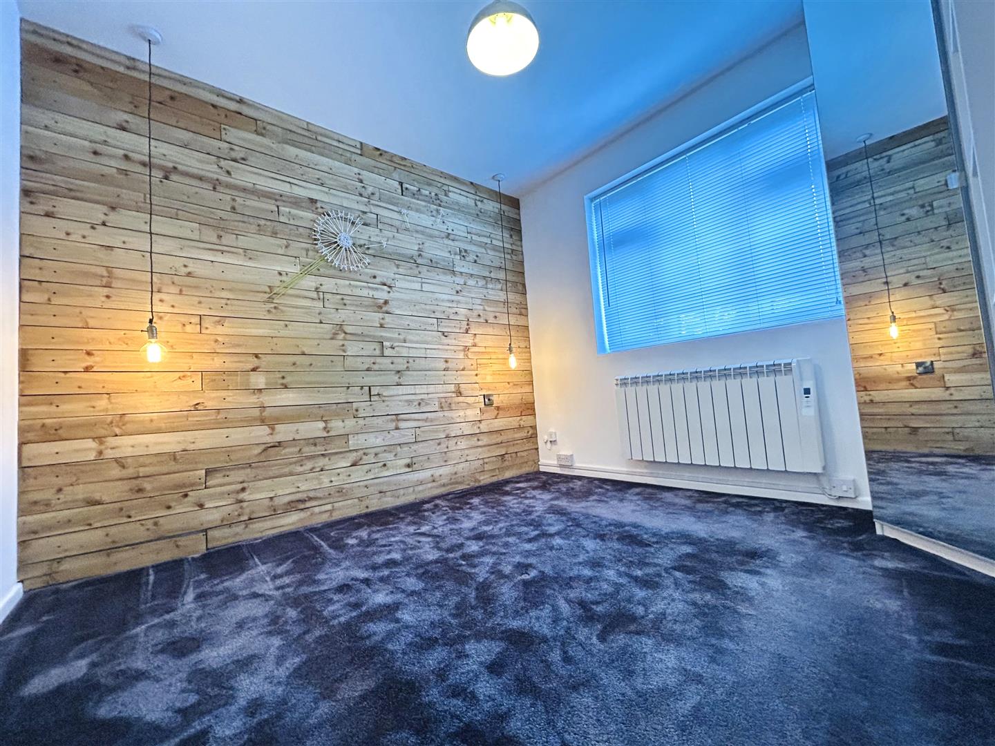 Window to front, electric radiator. Built in corner shaped wardrobe with mirror. Wood panelled wall with two feature lights.