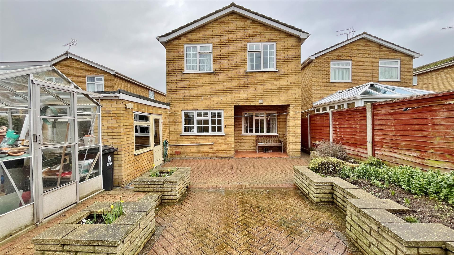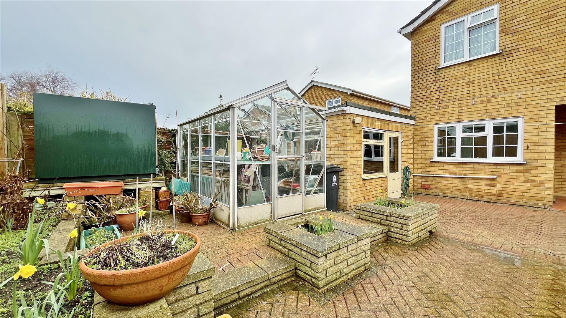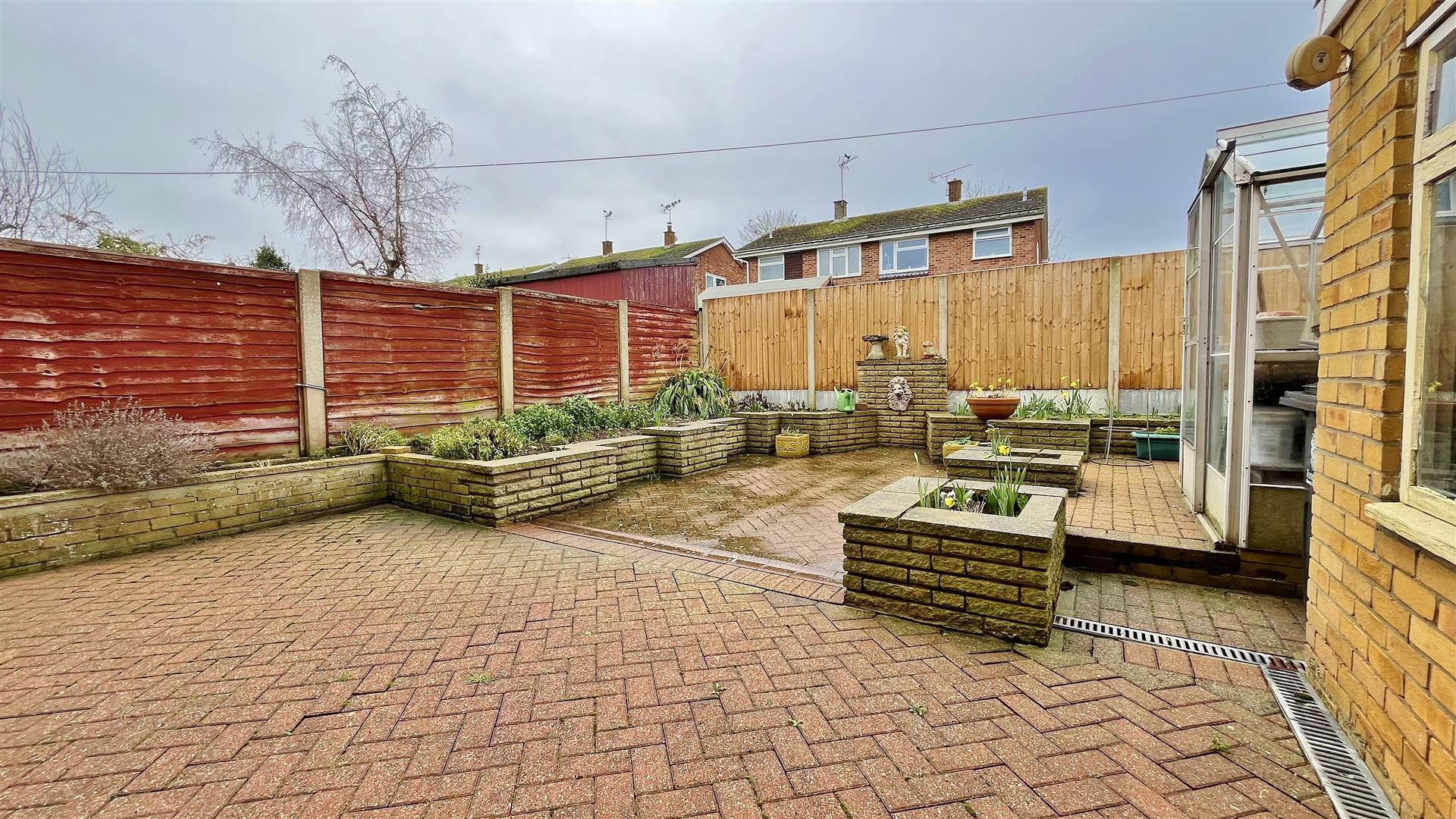 Low maintenance paved rear garden. South Facing. Array of plants and shrubs Greenhouse to remain. Outside light. Private access door to garage.