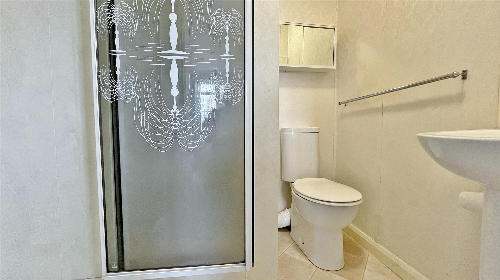 White suite comprises low level w/c. Pedestal wash hand basin. Fitted shower cubicle with wall mounted shower attachment. Extractor fan. Vinyl flooring.