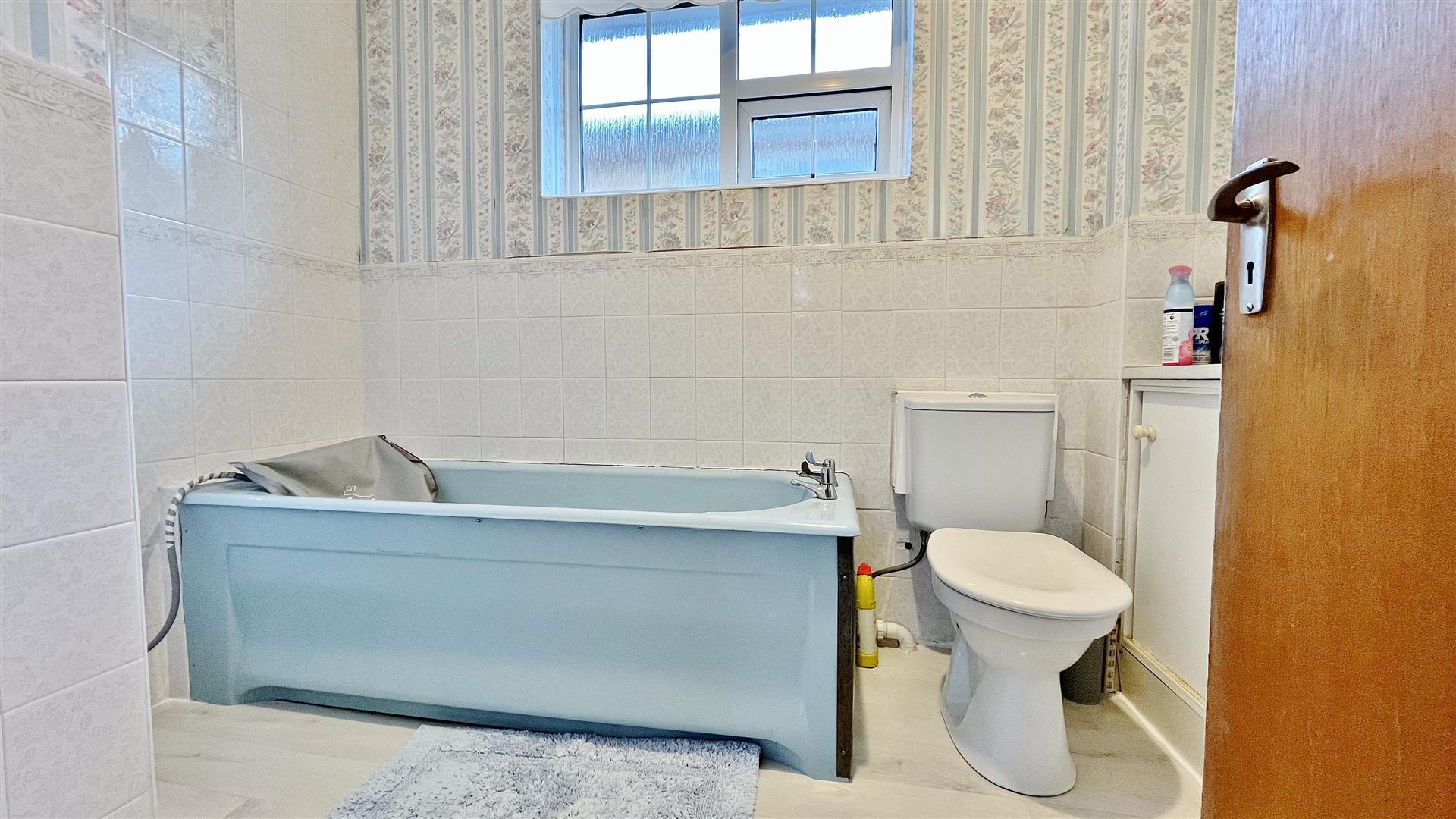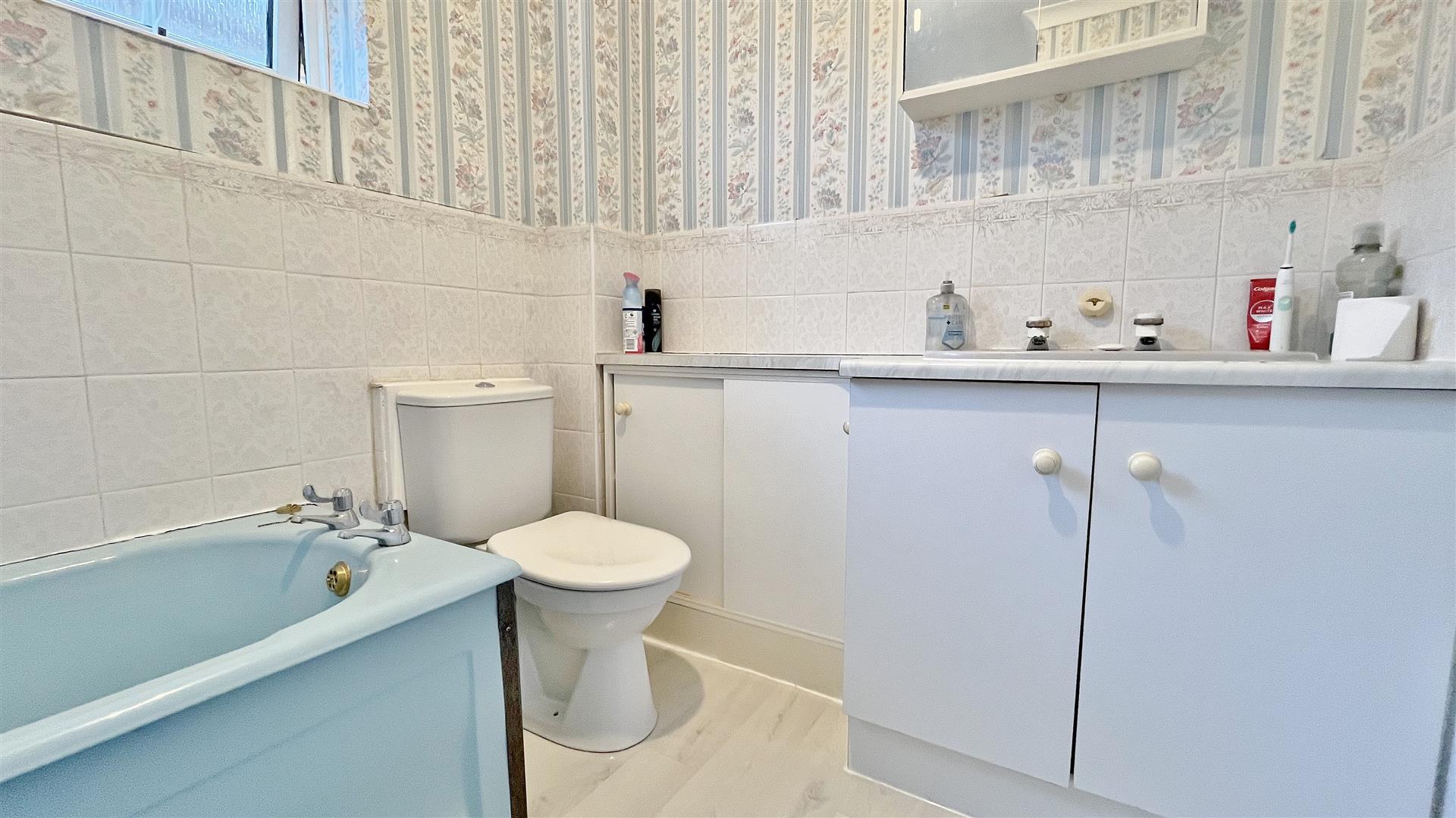 Suite comprises low level w/c. Vanity hand wash basin with storage cupboards under. Fitted panelled bath. Fully tiled walls. Obscured sealed unit double glazed window to side.