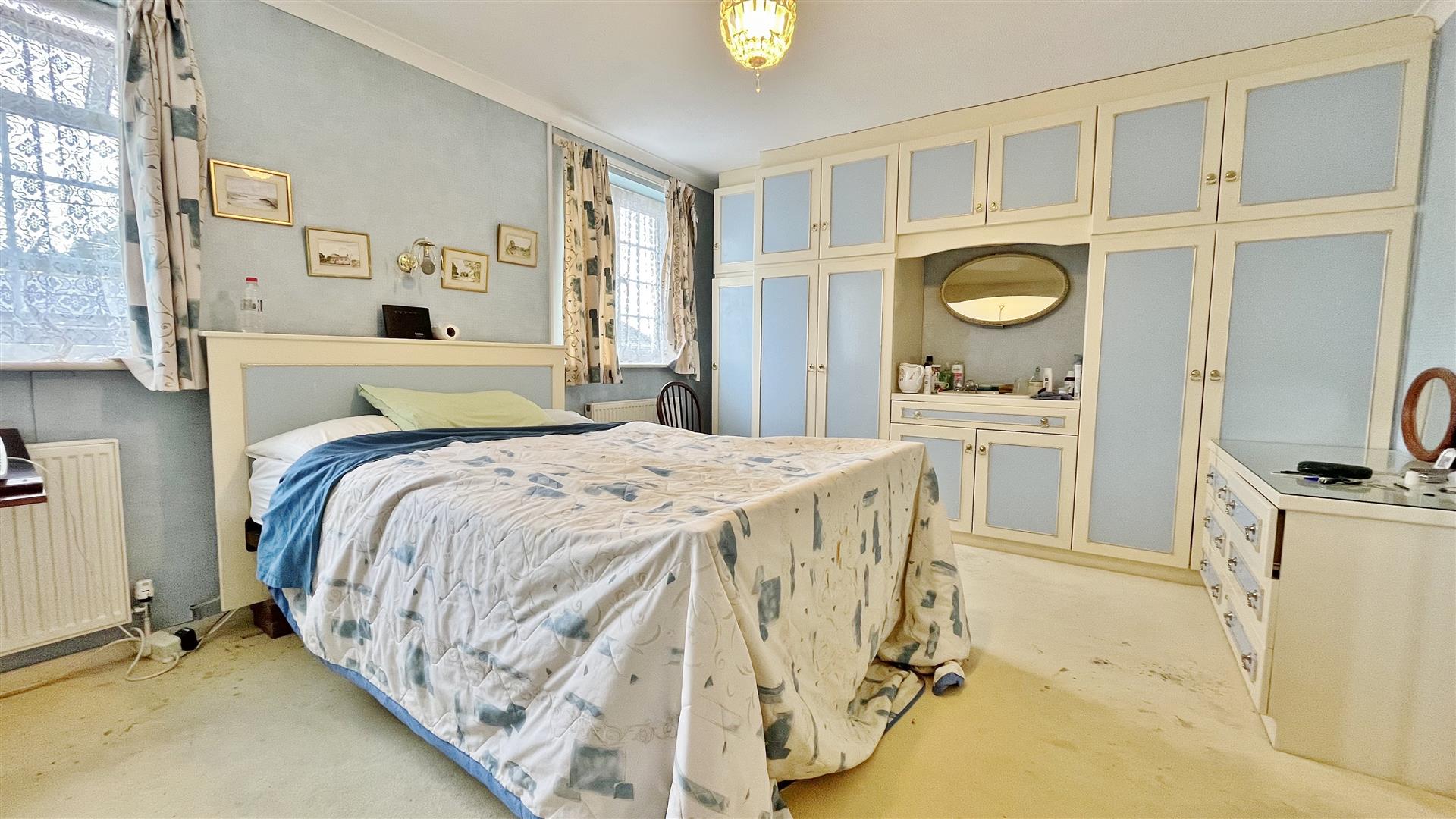 Fitted wardrobes. Vanity wash hand basin with storage cupboards under. Two radiators. Two sealed unit double glazed windows to front.