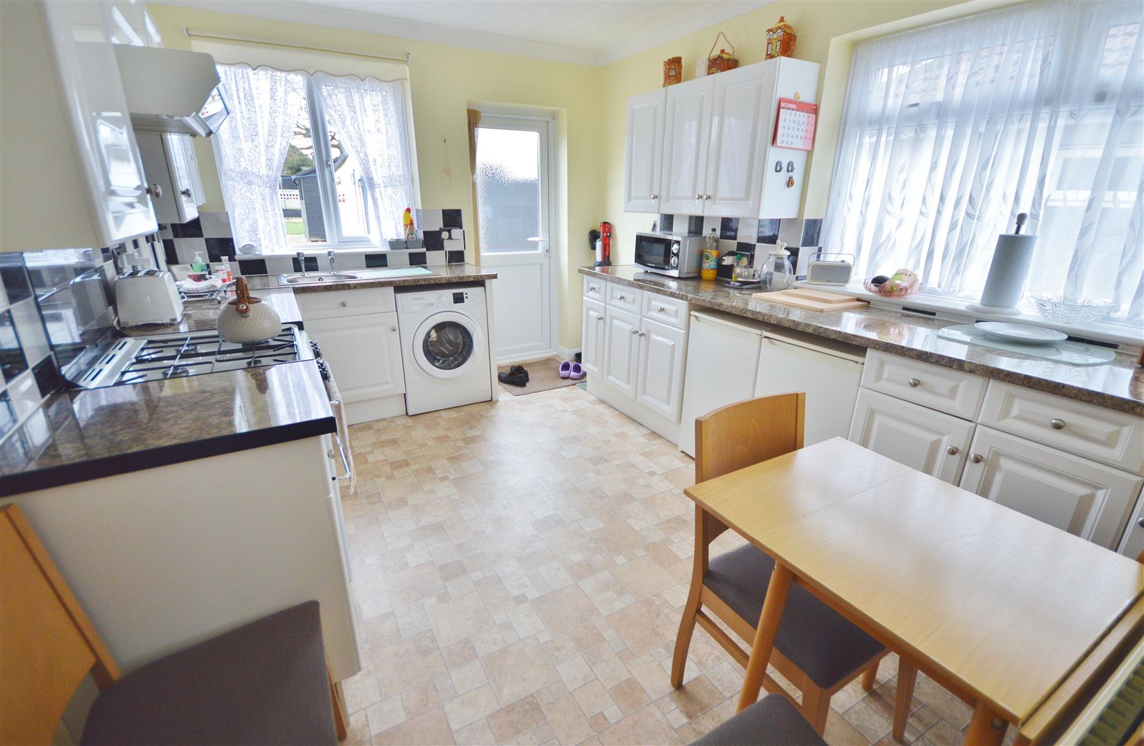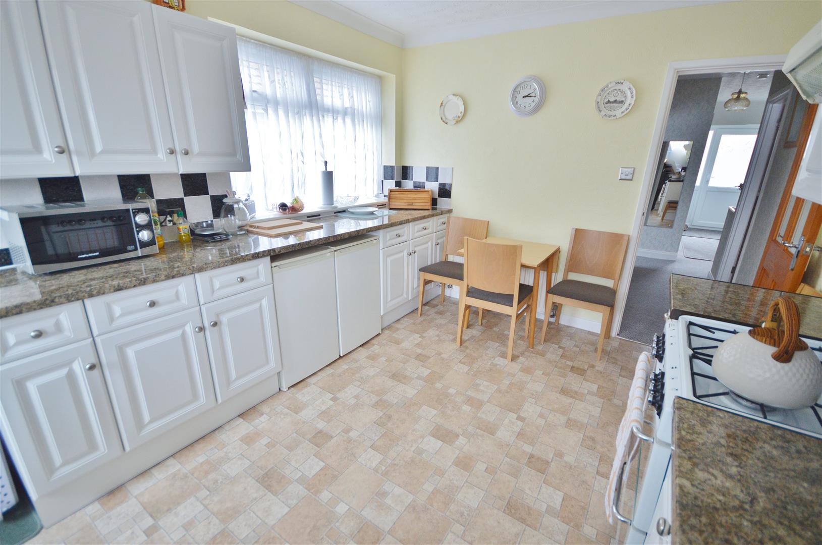 Fitted kitchen suite comprising laminated rolled edge work surfaces with inset single drainer stainless steel sink unit. Space for gas cooker with extractor hood above (not tested). Space and plumbing for washing machine. Space for fridge and freezer. Selection of White gloss fronted wall units with cupboards and drawers at both eye and floor level. Tiled splashbacks. Wall mounted gas combination boiler (not tested). Radiator. Double glazed windows to side and rear. UPVC Double glazed door leading to the rear garden.
