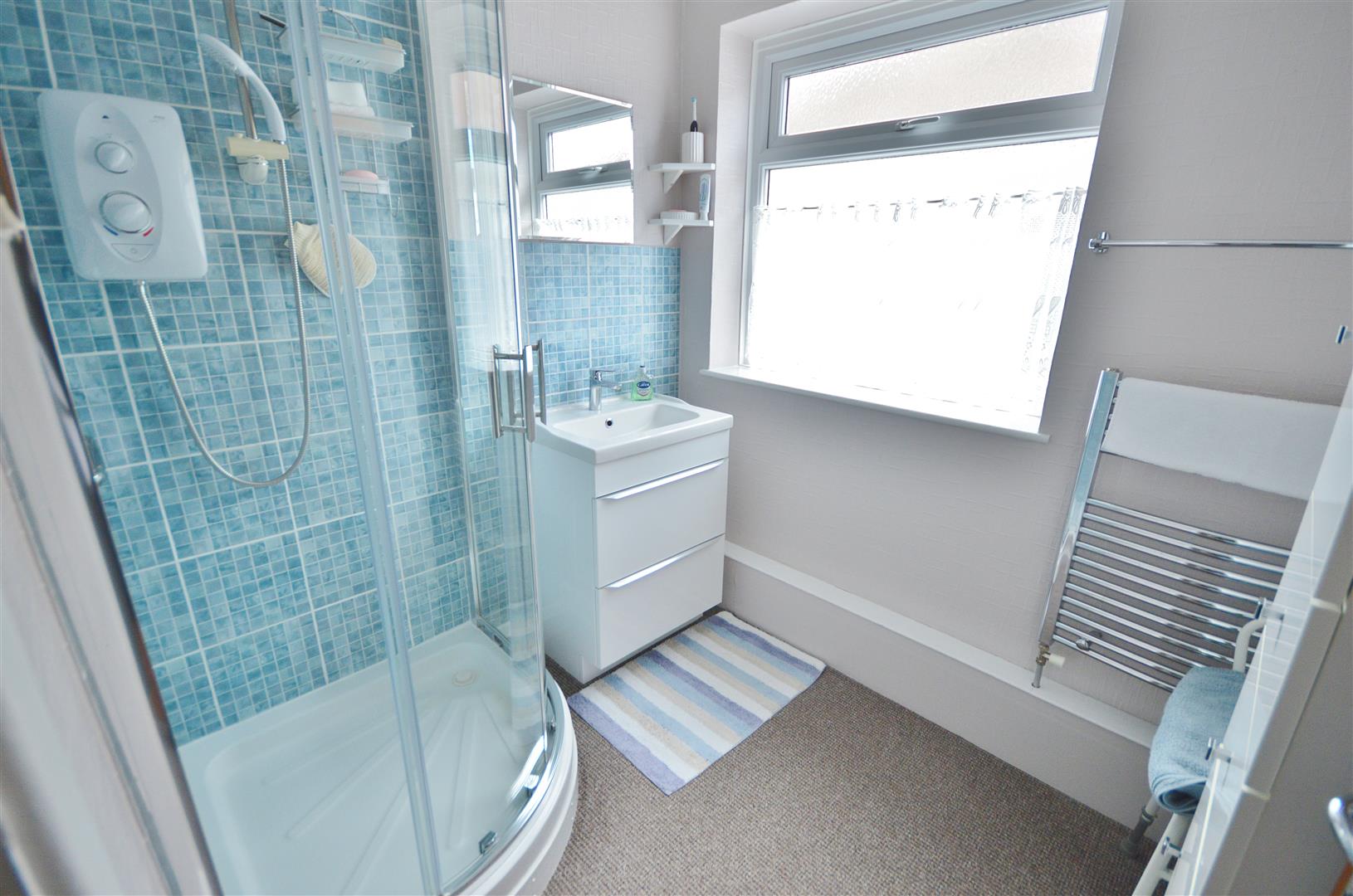 Two piece suite comprising a vanity hand wash sink basin with stainless steel mixer tap. Step in shower cubicle with wall mounted electric shower and shower head attachment above (not tested). Heated towel rail. Double glazed window to side.
