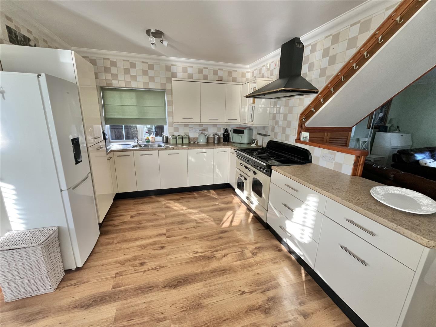 Fitted with a range of white gloss fronted units comprising square edge work surfaces with cupboards and drawers below. A range of matching wall mounted units. Inset one and a half drainer stainless steel sink unit with mixer tap. Range cooker space with extractor hood above. Space for for fridge freezer. Tiled splashbacks. Radiator. Double glazed window to front. Double glazed window to side. Door to :