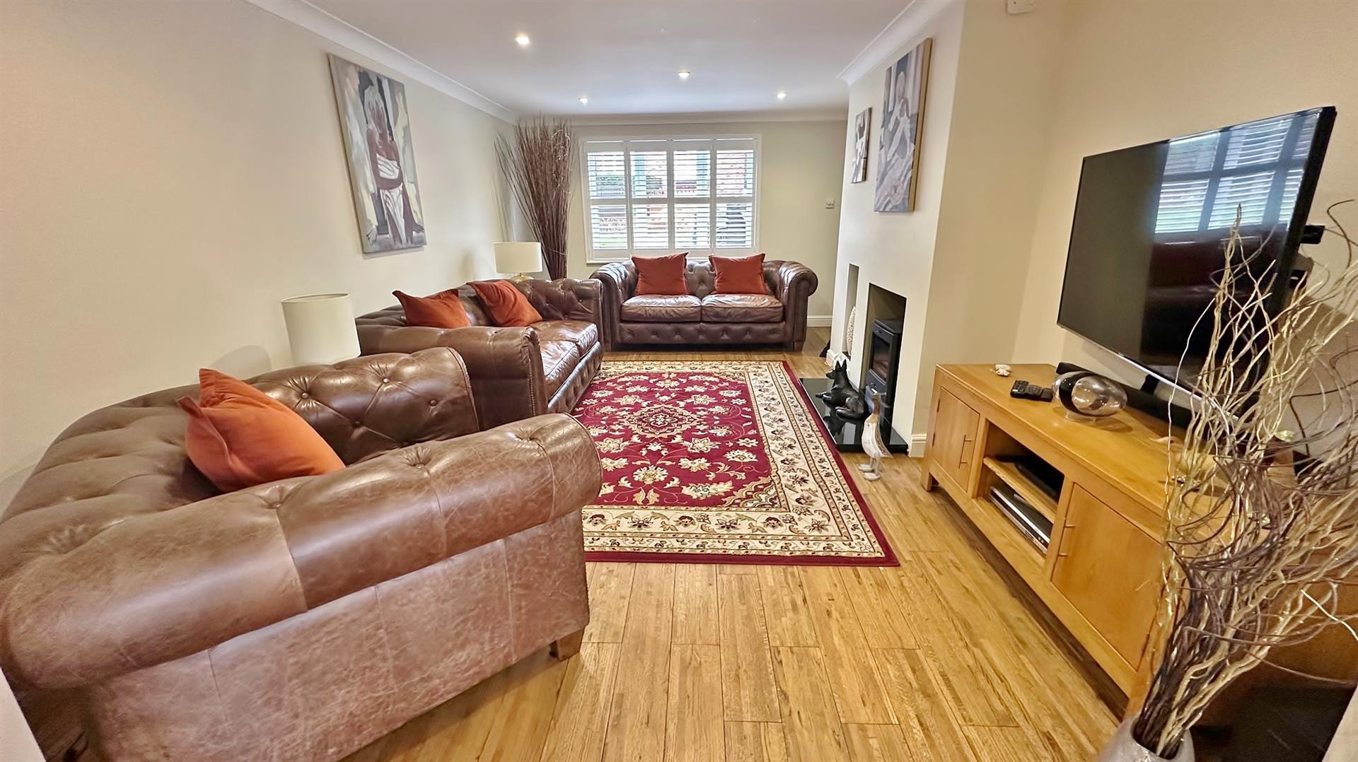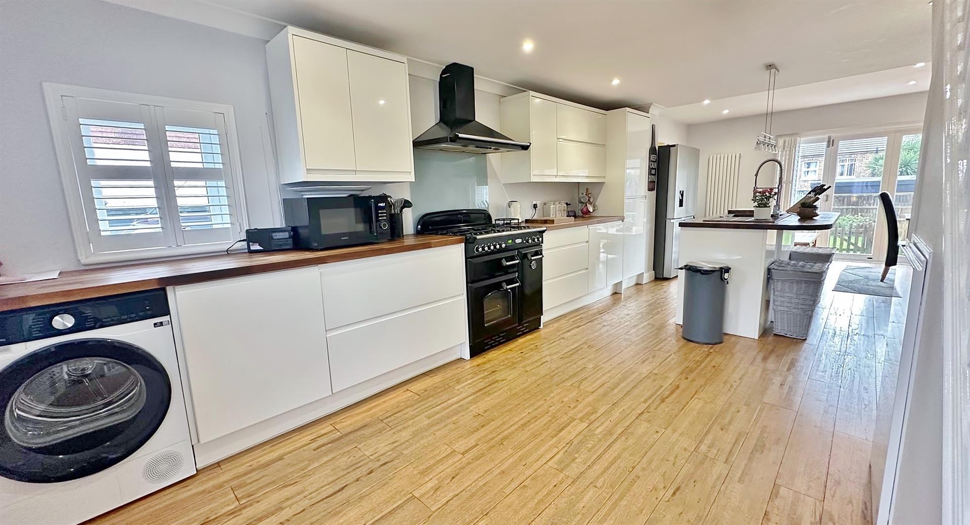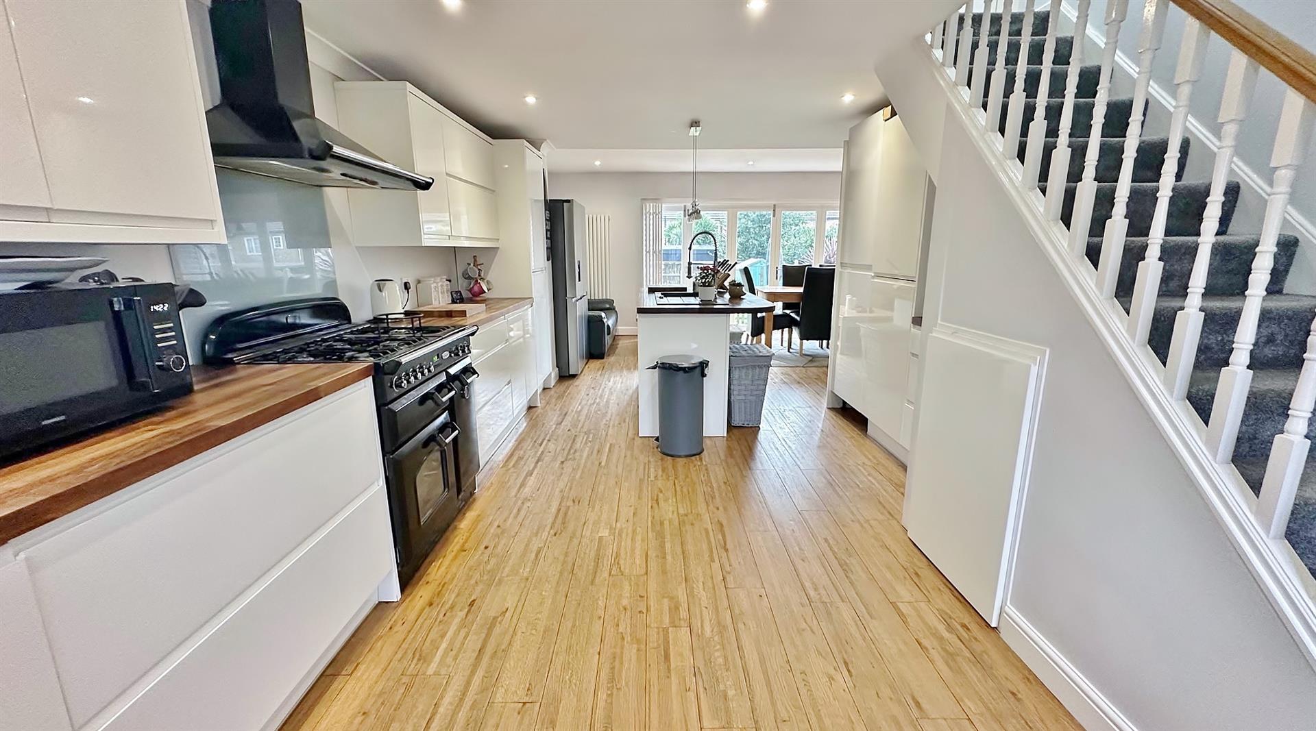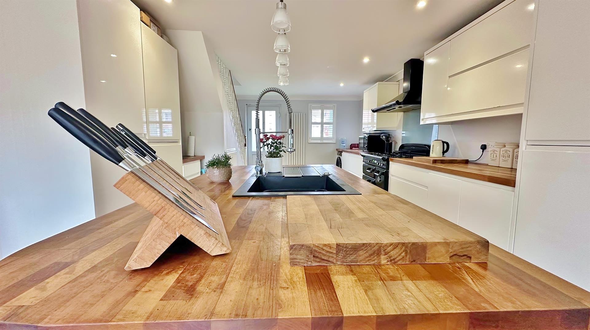 Wonderfully presented modern fitted kitchen comprising: Oak work surfaces with plumbing and space for range oven, washing machine and fridge freezer. Island with matching Oak work surfaces with inset single drainer sink unit. Selection of white high gloss units at eye and floor level. Integrated dishwasher (not tested). Designer radiator. Stair flight to first floor. Under stairs storage cupboard. Double glazed window to side and front with fitted shutters. Open access dining room. Door to lounge.