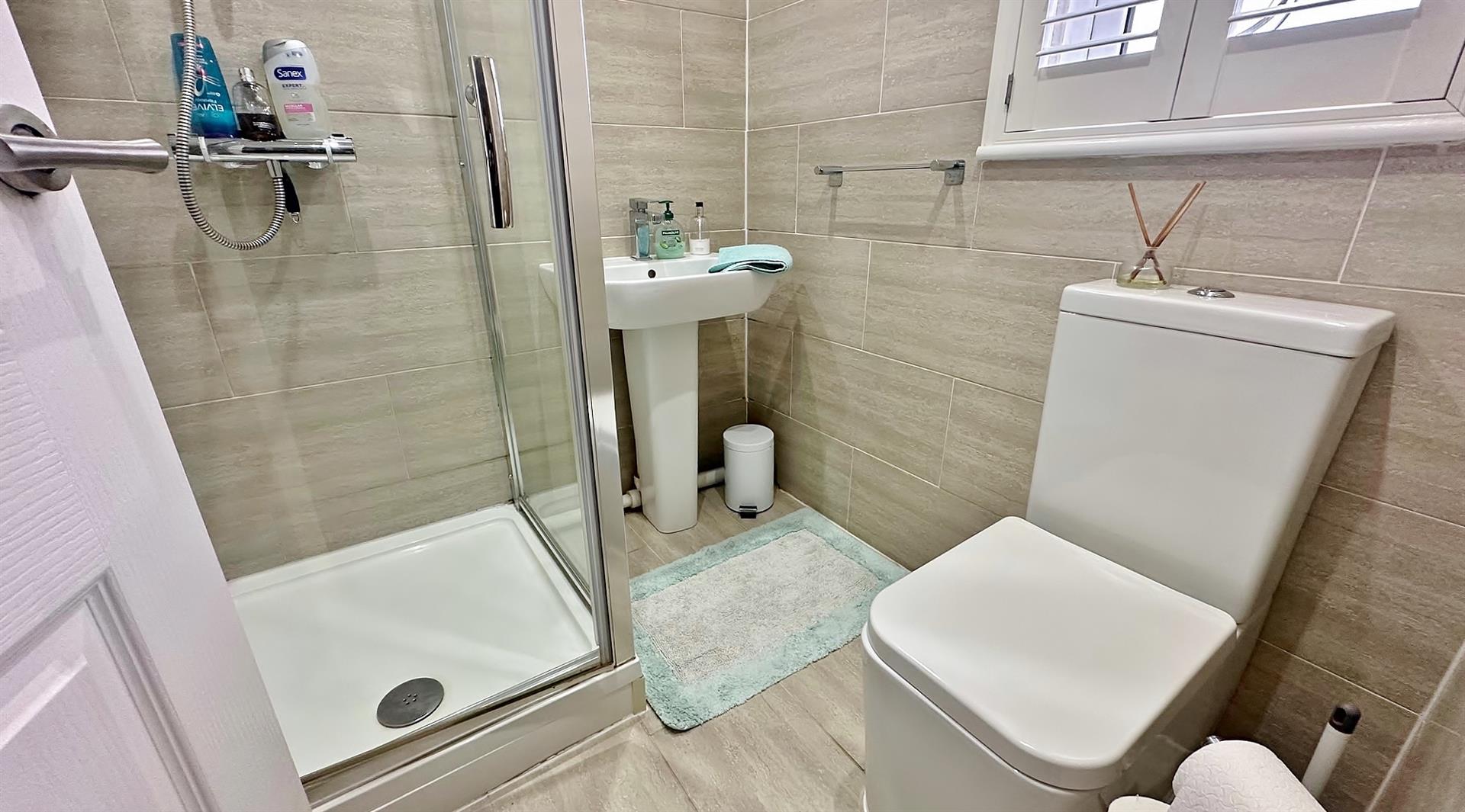 Fully tiled shower room with independent shower cubicle. Low level WC. Pedestal wash basin. Double glazed window to rear with fitted shutters.