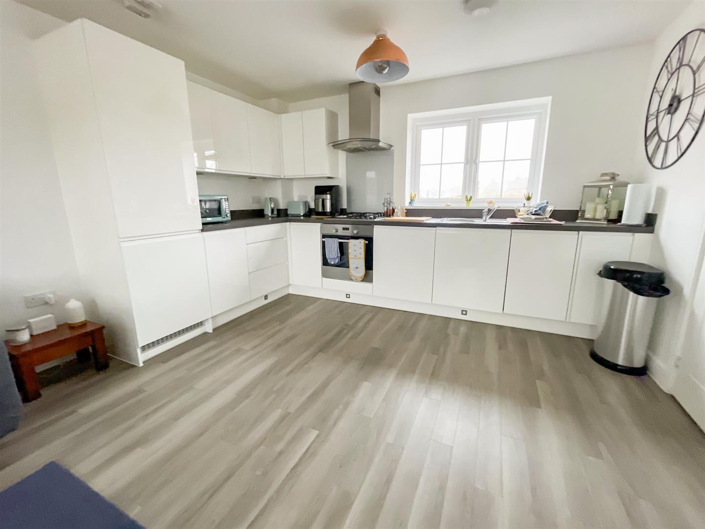 Fitted with a range of white high gloss units at both eye and floor level. Laminated square edge work surfaces with inset single drainer stainless steel sink unit. Integrated electric oven. Inset four ring gas hob with extractor hood above. Integrated fridge/freezer. Integrated washing machine. Integrated dishwasher. Double glazed window to rear.