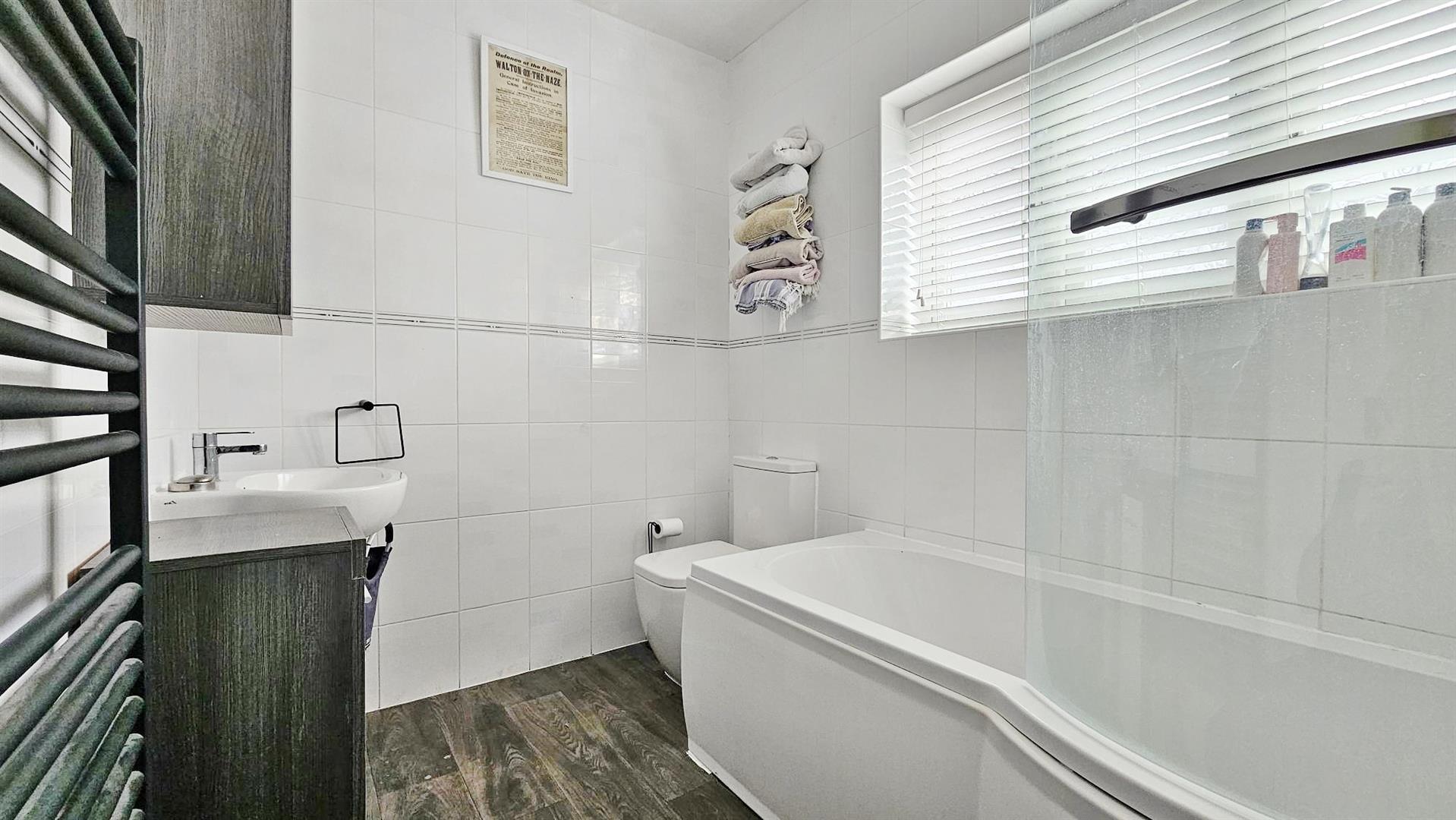 Modern suite comprises of low level WC. Pedestal wash hand basin with mixer tap. Enclosed P-shaped bath with fitted shower screen and wall mounted shower attachment. Fully tiled walls. Vinyl flooring. Fitted cabinet. Wall mounted heated towel rail. Obscured sealed unit double glazed window to side.