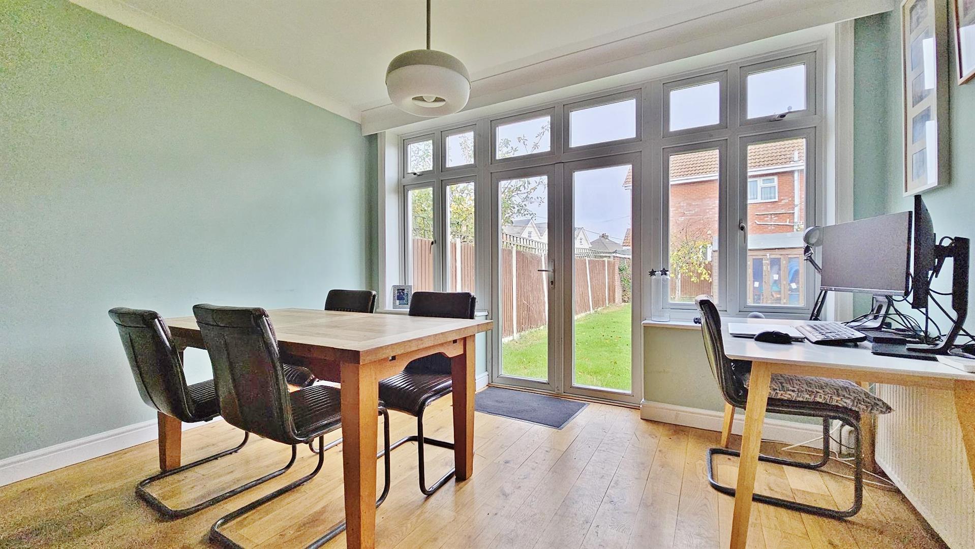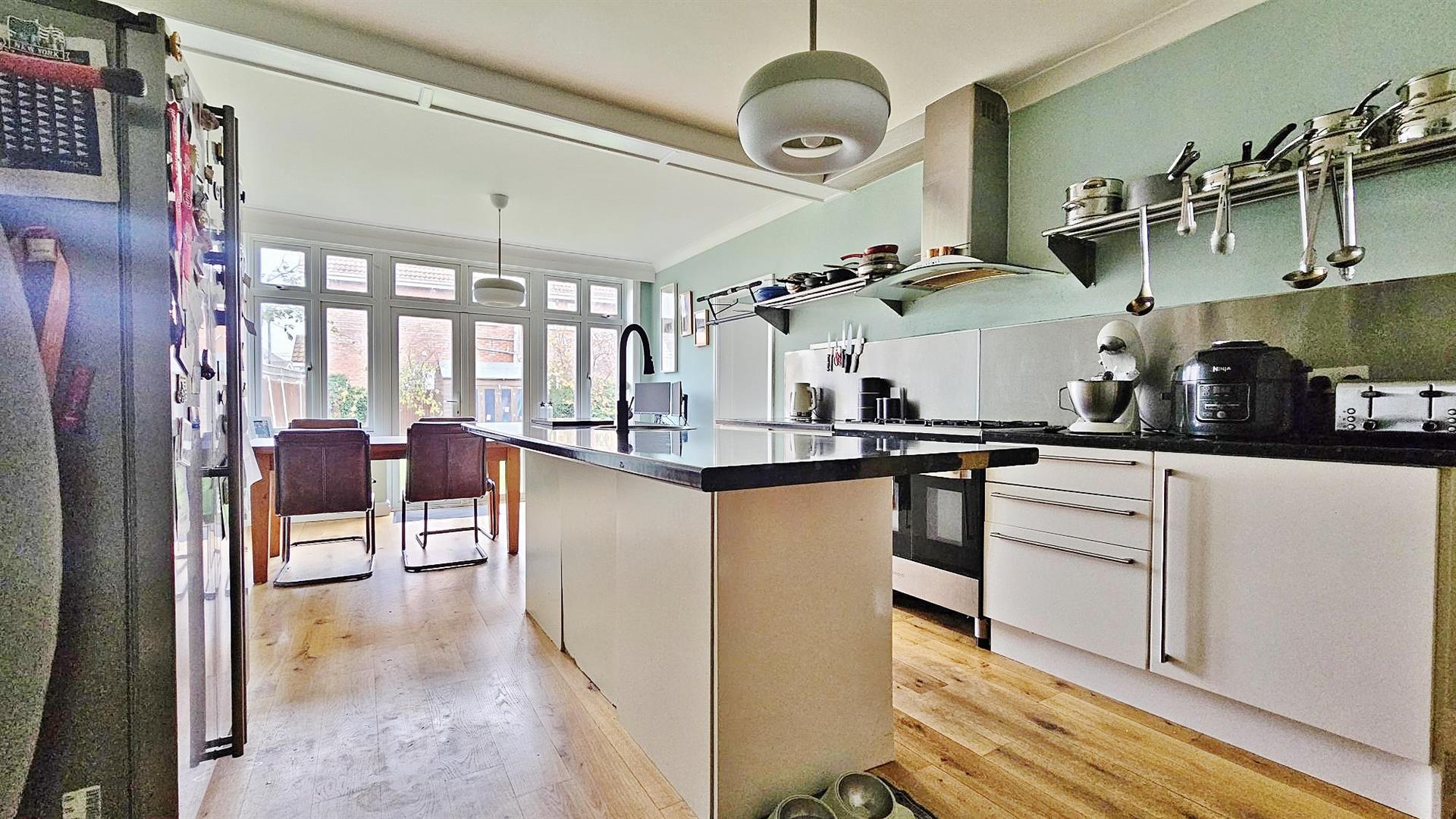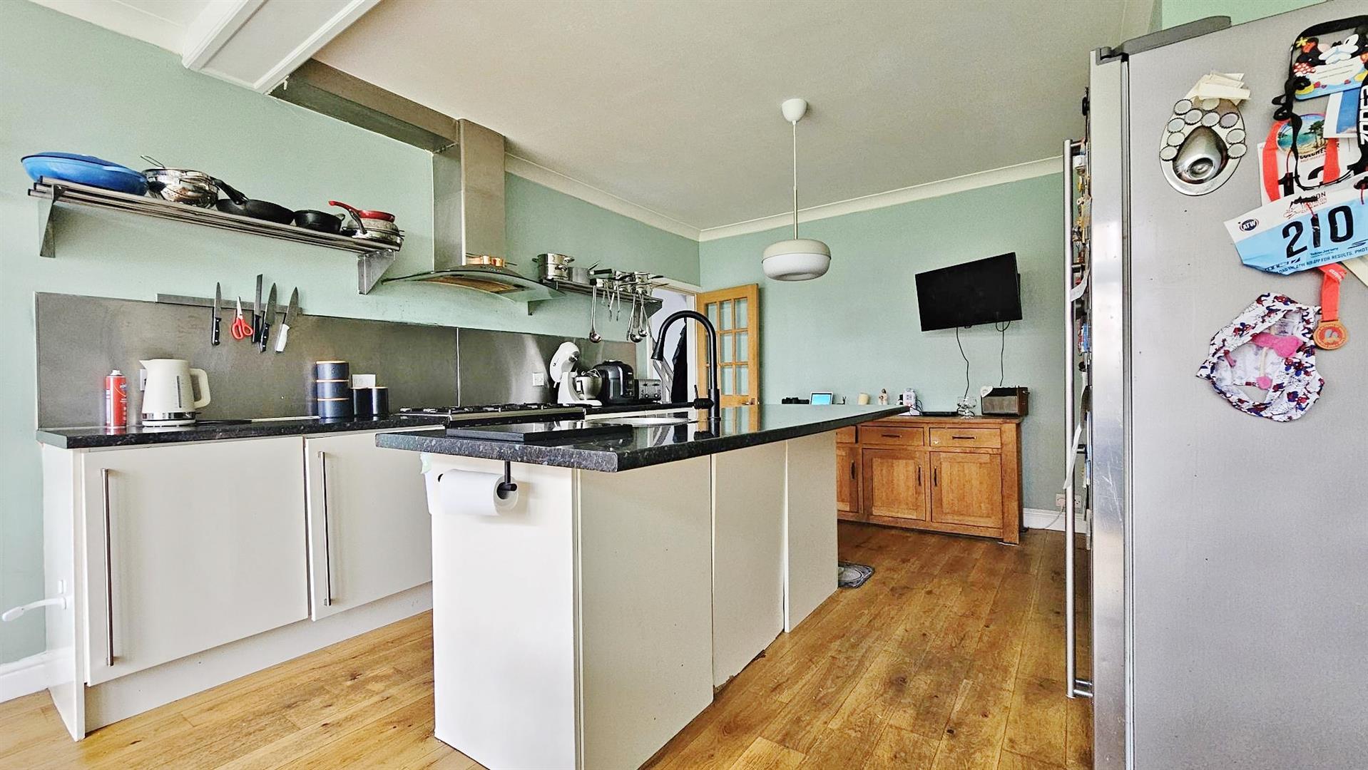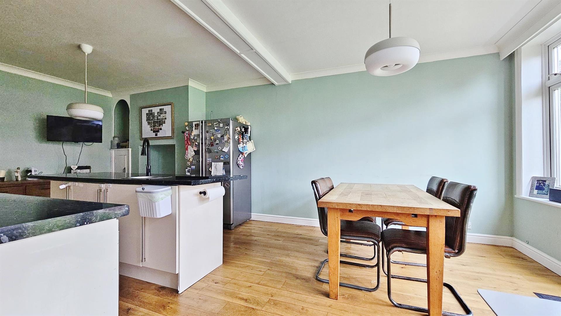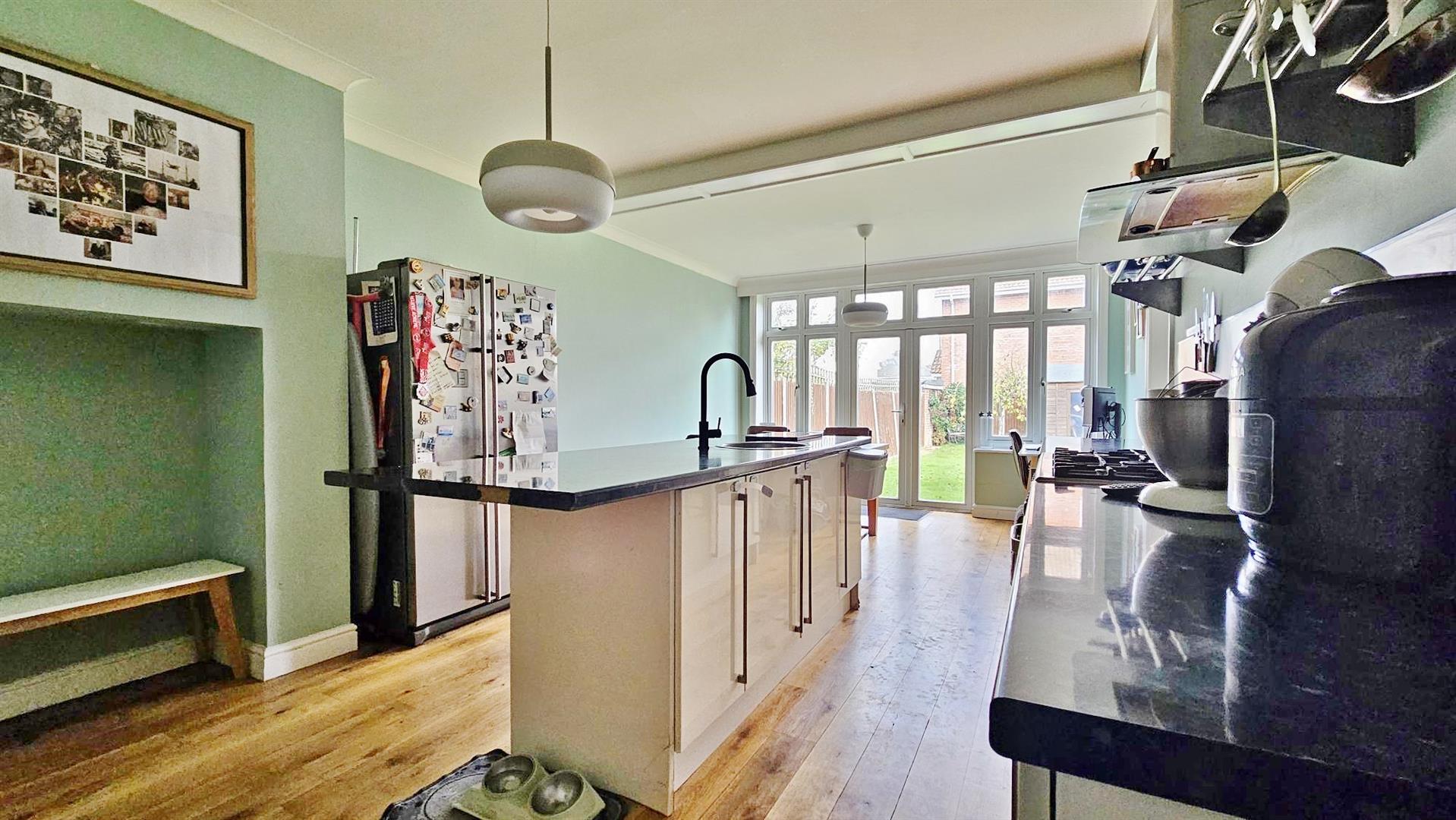 Fitted with a range of matching floor level fronted units. Rolled edge work surfaces. Inset stainless sink and mixer tap. Cooker to remain with extractor hood above. Fitted breakfast bar with cupboards under and space for seating area. Built in storage cupboard. Space for fridge/freezer. Solid wood flooring. Splashback. Two radiators. Sealed unit double glazed windows to rear. Sealed unit double glazed double doors leading to rear garden. Open access to: