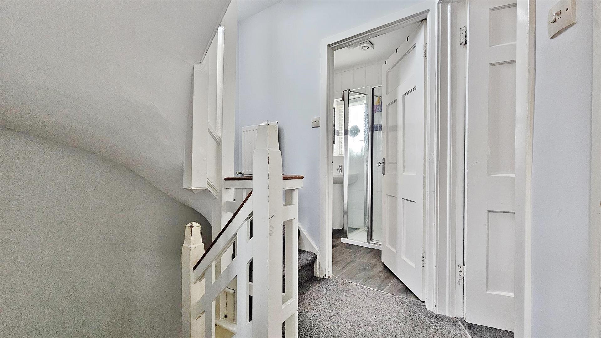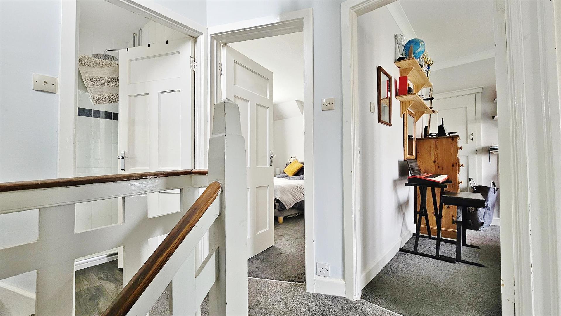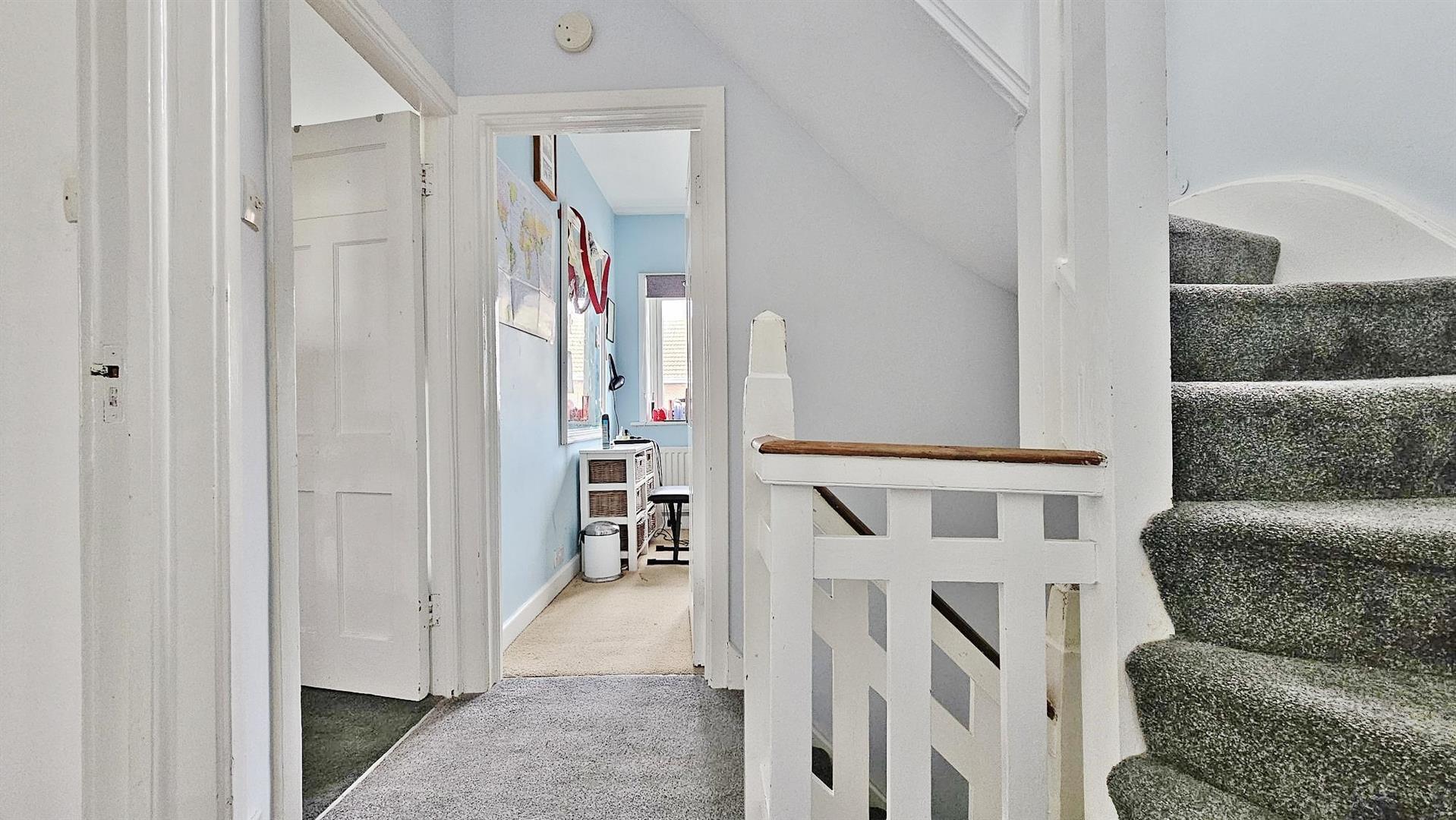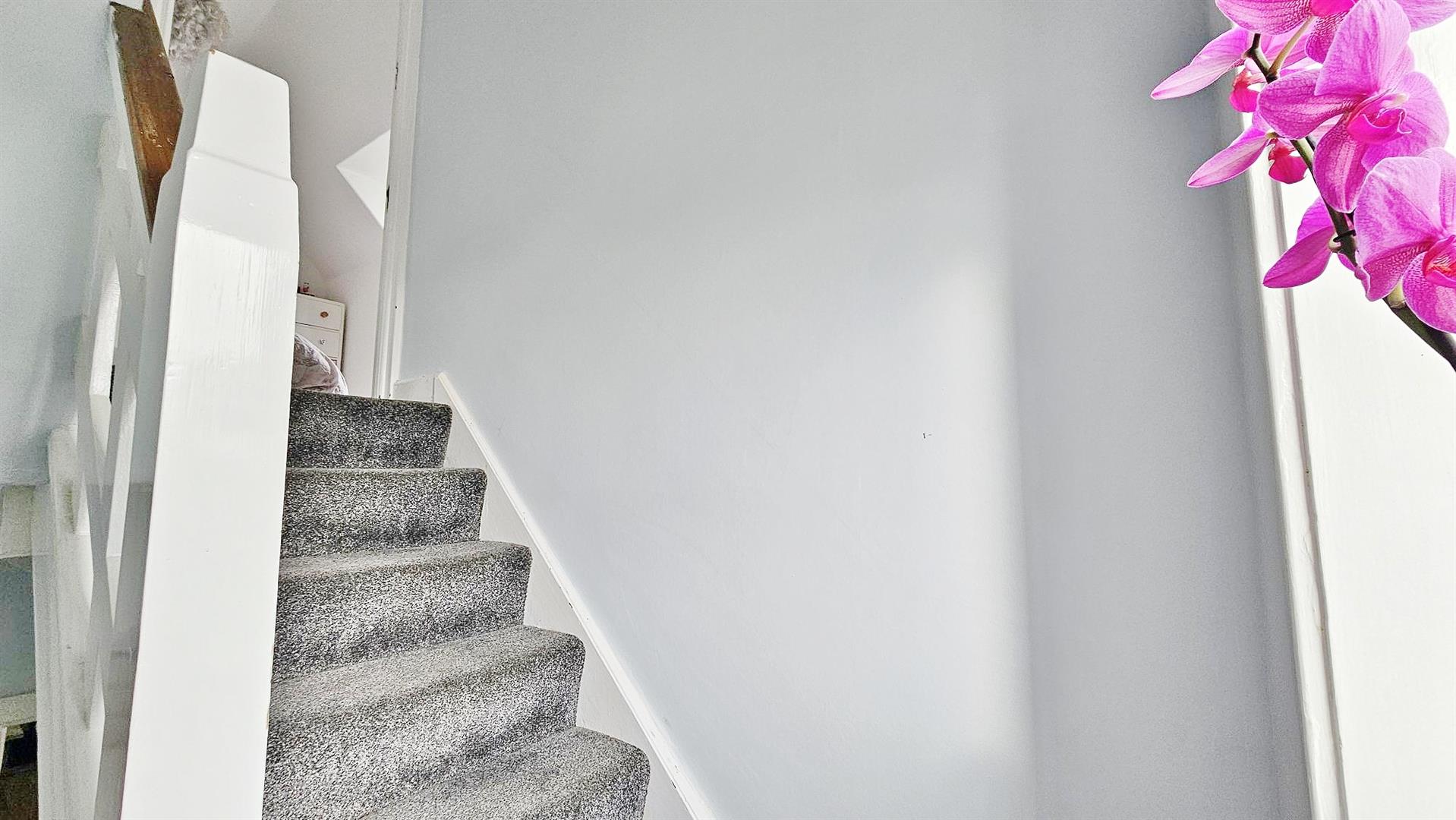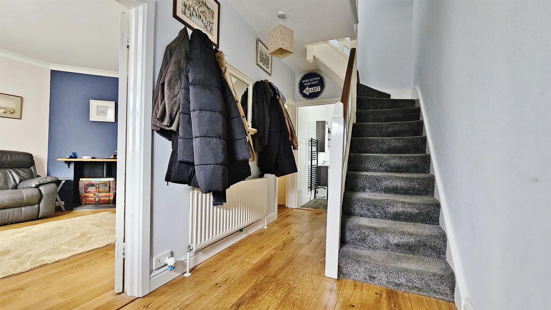Stair flight to first floor. Solid wood flooring. Under stairs storage cupboard. Radiator. Doors to: