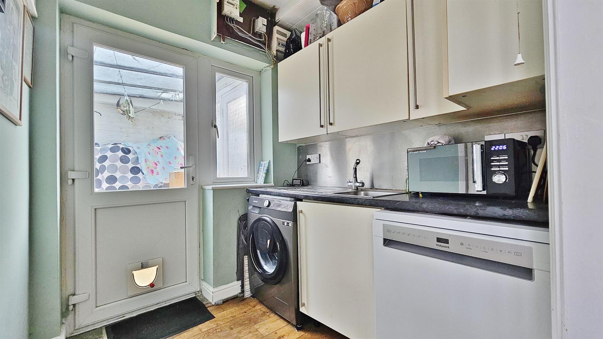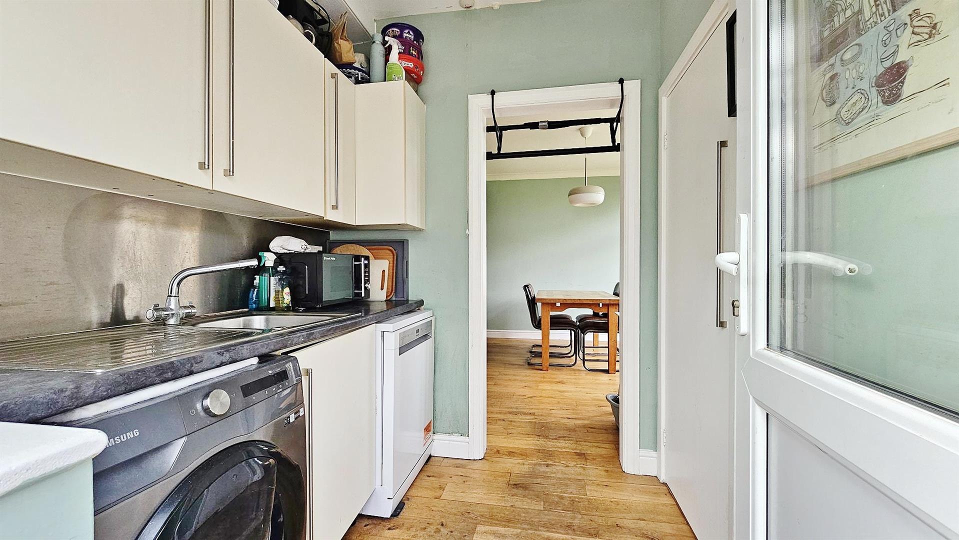Built in storage cupboard. Wood effect vinyl flooring. Space for tumble dryer. Range of clear and obscured windows and doors to front and rear. Hardwood door leading to: