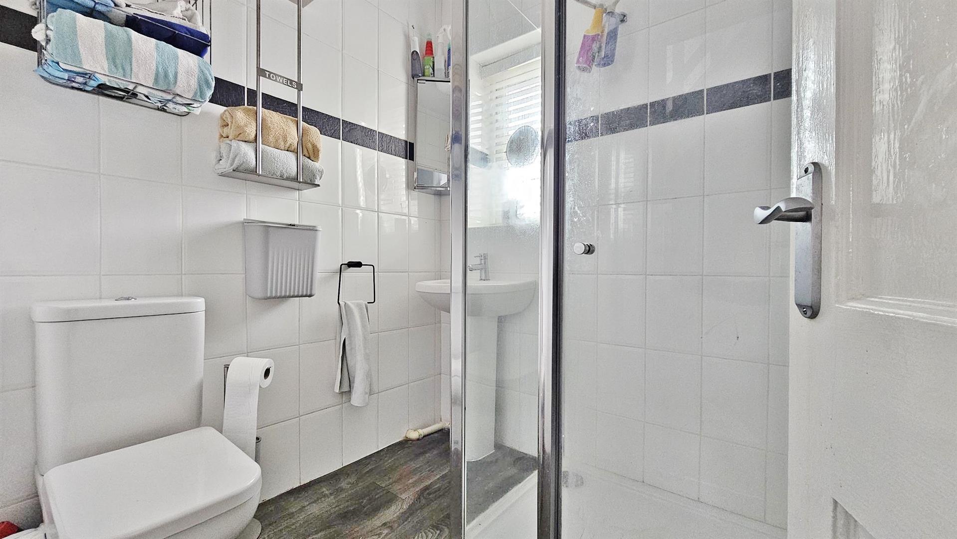 Modern suite comprises of low level WC. Pedestal wash hand basin with mixer tap. Fitted shower cubicle with wall mounted shower attachments. Fully tiled walls. Vinyl flooring. Extractor fan. Wall mounted heated towel rail. Obscured sealed unit double glazed window to front.