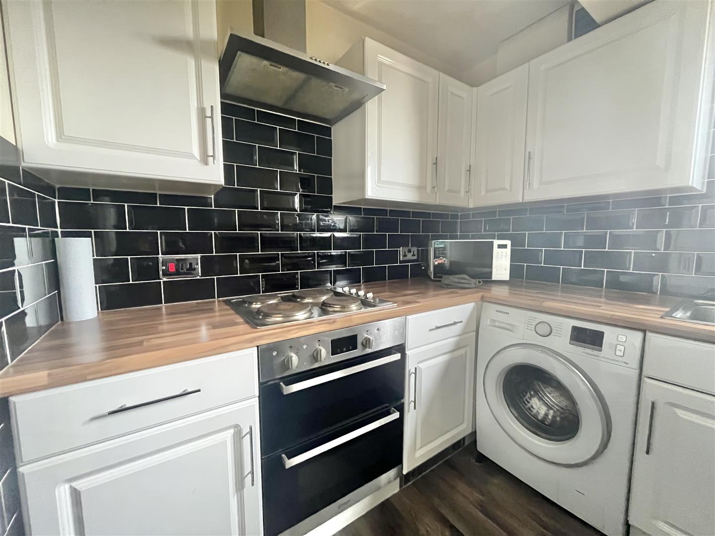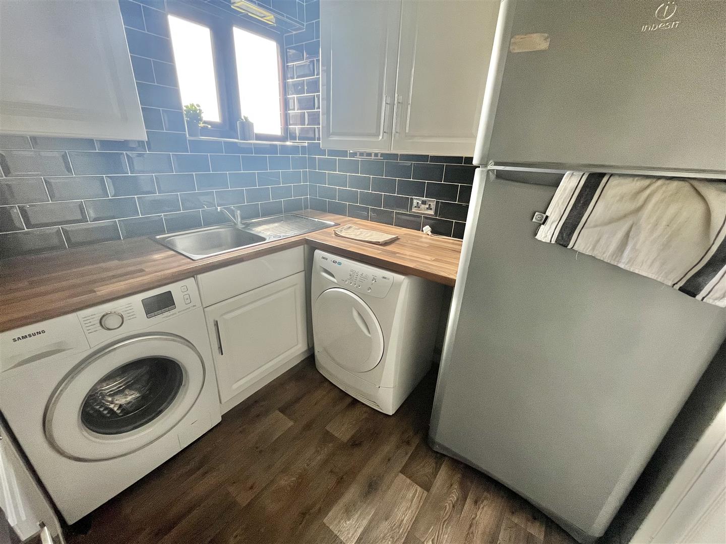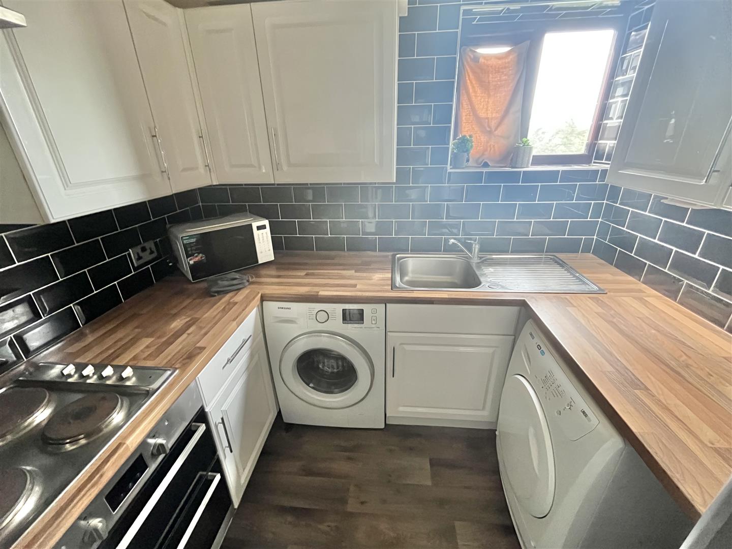Fitted kitchen suite comprising wood effect square edge work surfaces with White wall mounted cabinets with cupboards and drawers below. Inset four ring cooker with extractor hood above. Inset oven. Inset single drainer stainless steel sink unit with mixer tap (all appliances not tested). Space for washing machine. Space for dryer. Space for fridge freezer. Tiled splashbacks. Double glazed window to side.