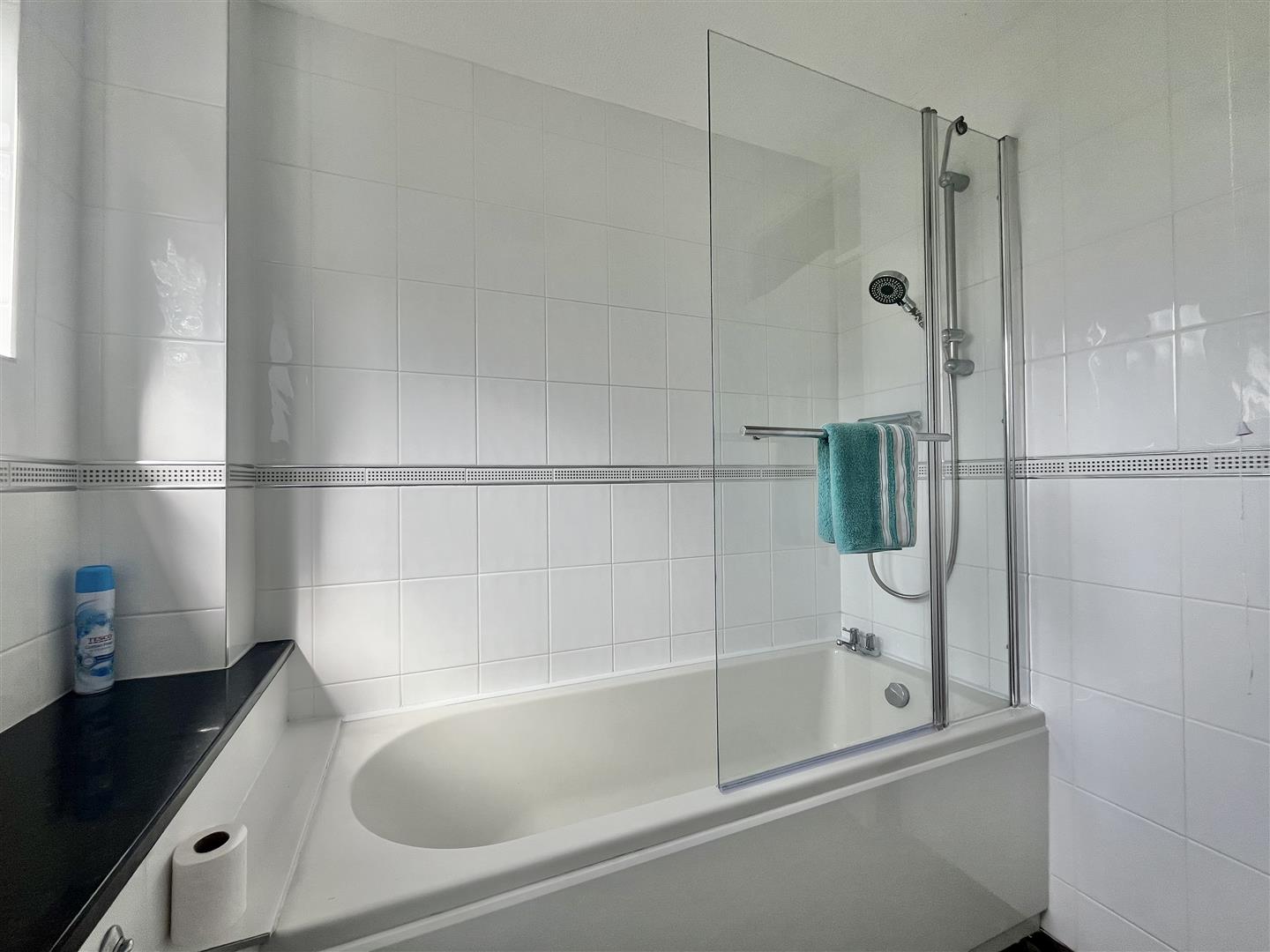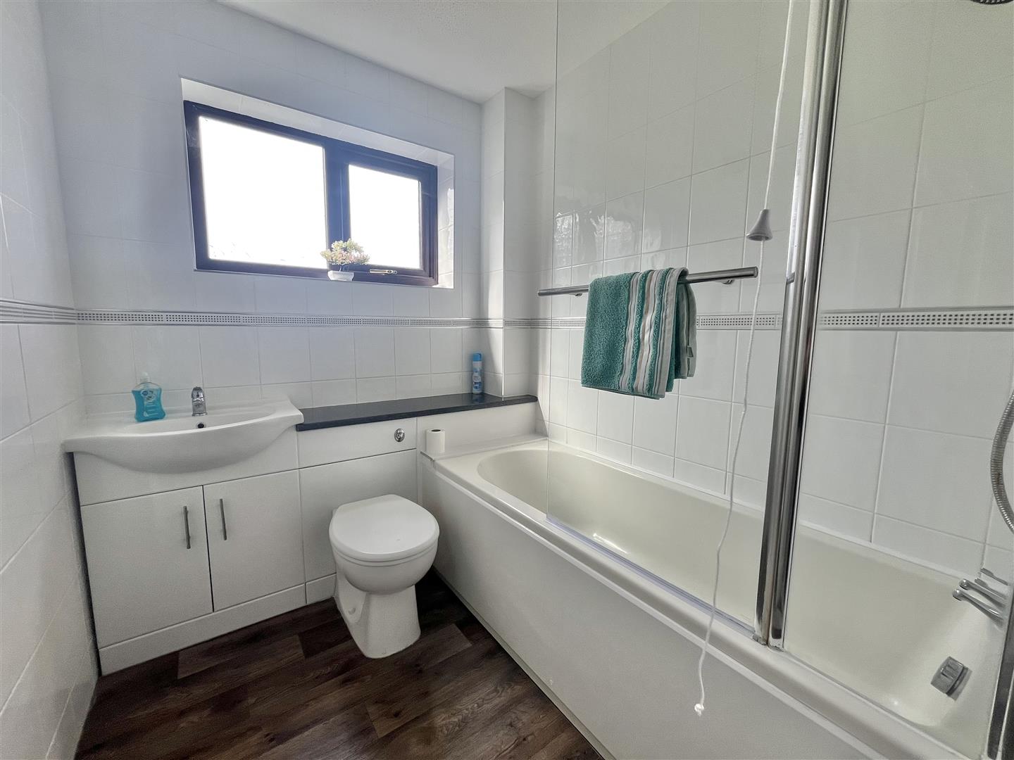 Three piece suite comprising low level W.C. Vanity wash hand sink basin unit with cupboards below. Panelled bath with wall mounted shower attachment above (not tested). Fully tiled walls. Double glazed window to side.