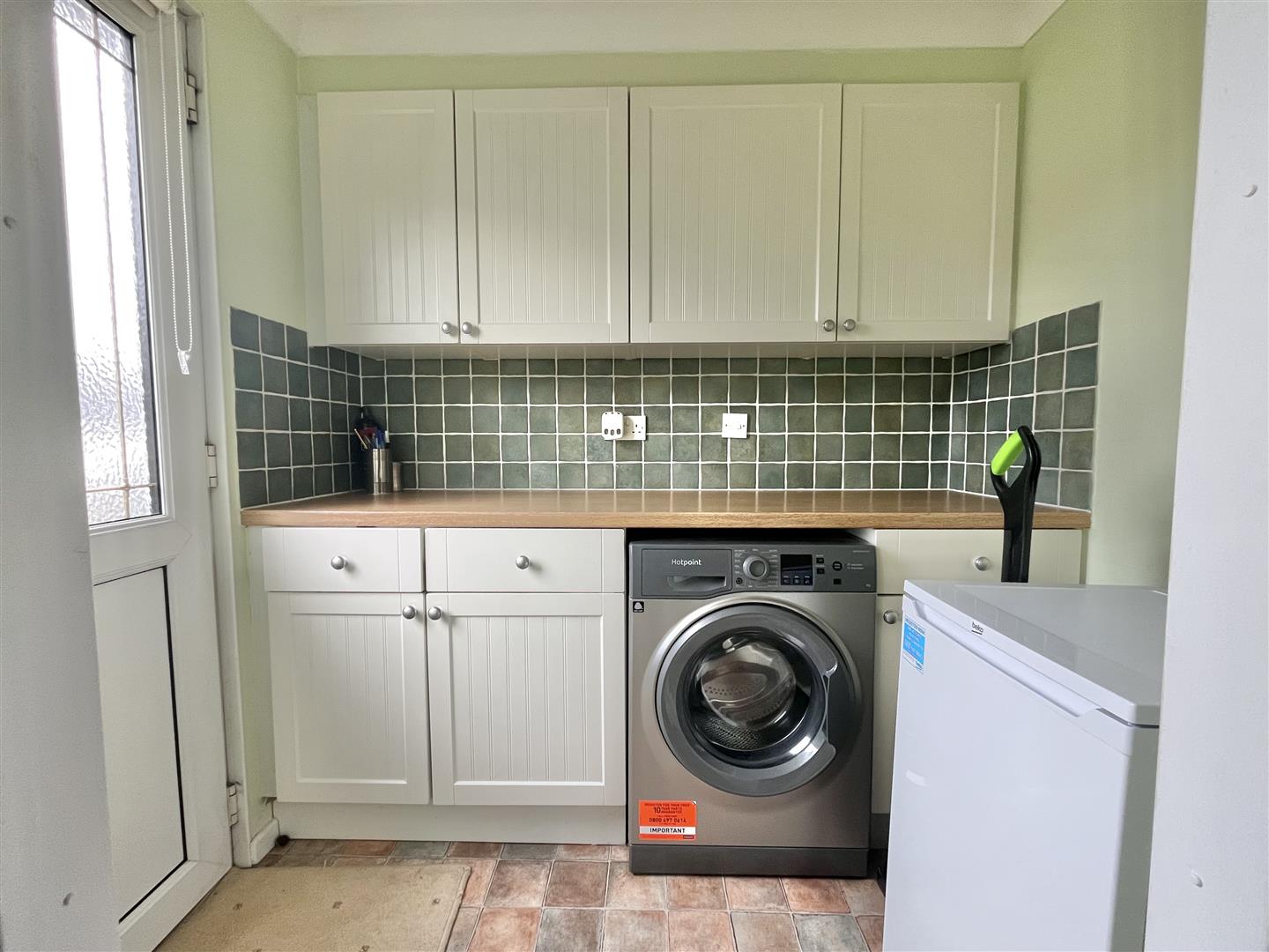 Oakwood effect square edge work surfaces with Crème wall mounted cabinets with cupboards and drawers below. Partly tiled walls. Space for washing machine. Door to garden area.