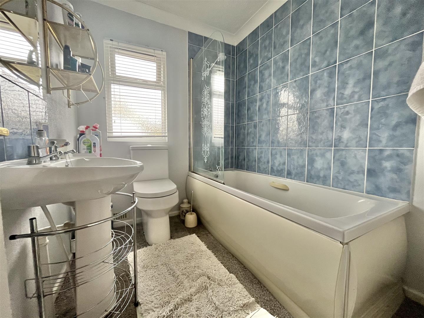 Three piece bathroom suite comprising low level W.C. Vanity wash hand sink basin unit. Panelled bath with electric wall mounted shower head above (not tested). Radiator. Double glazed window to front.
