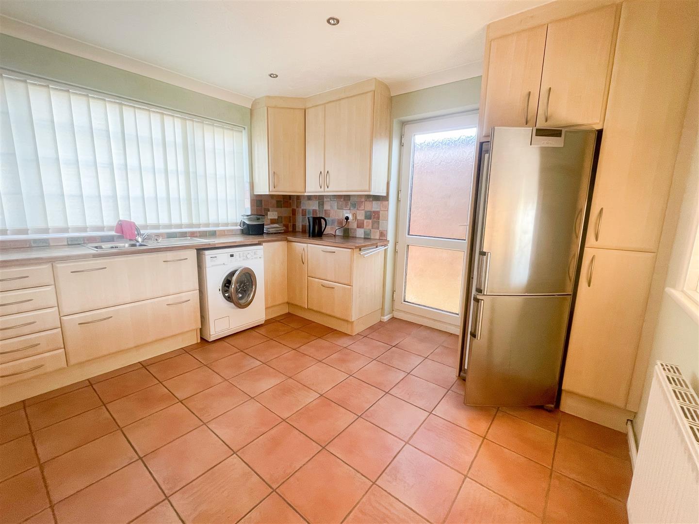 Wood effect fronted units at both eye and floor level. Laminated square edge work surfaces with inset stainless steel single drainer sink unit. Inset eye level electric oven. Inset four ring gas hob with extractor hood above. Space for washing machine. Space for fridge/freezer. Part tiled walls. Radiator. Double glazed window to front. Double glazed door to side.