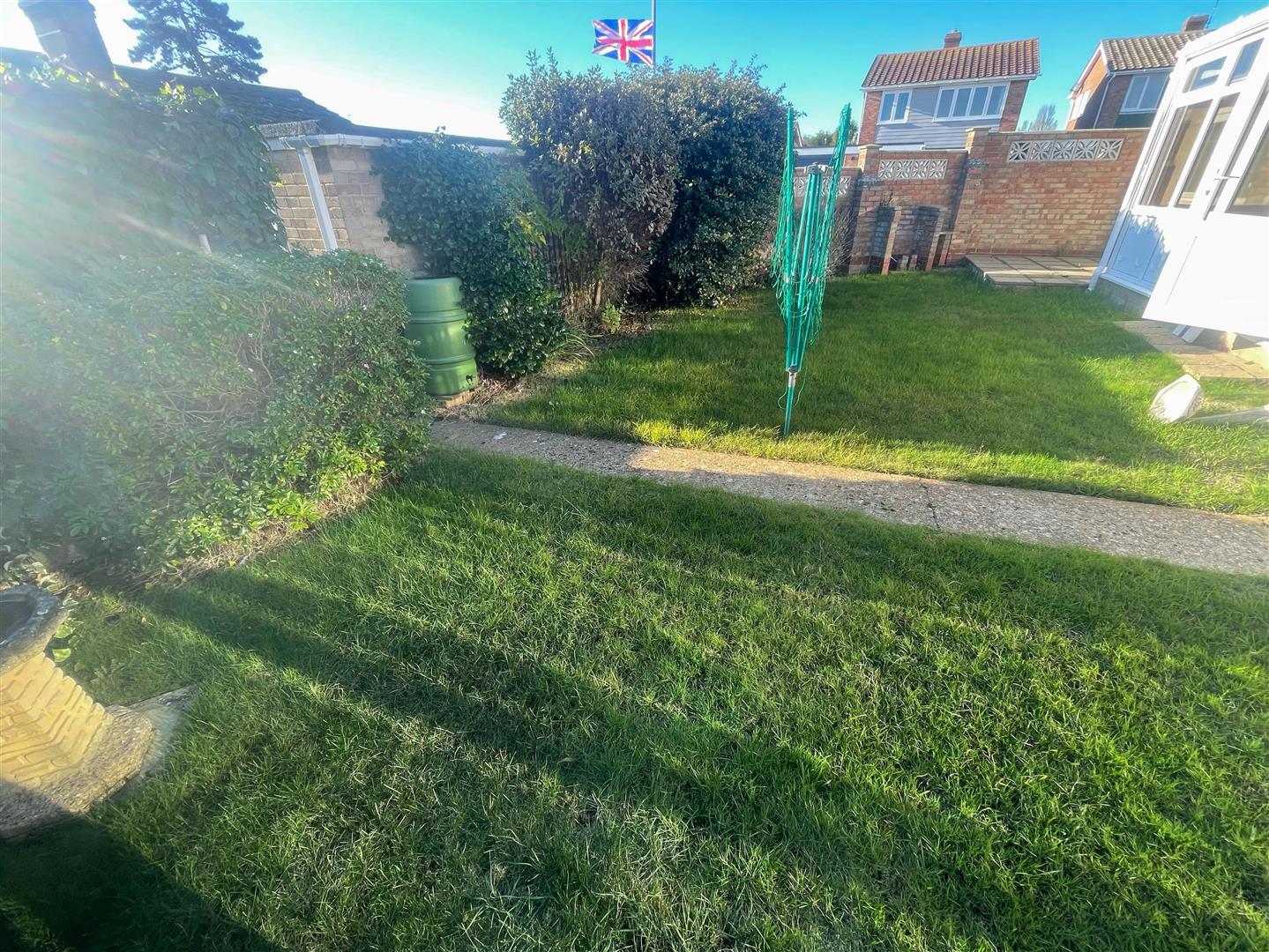 Corner plot. Laid to lawn. Paved area to side providing off street parking and access to garage via up and over door.
