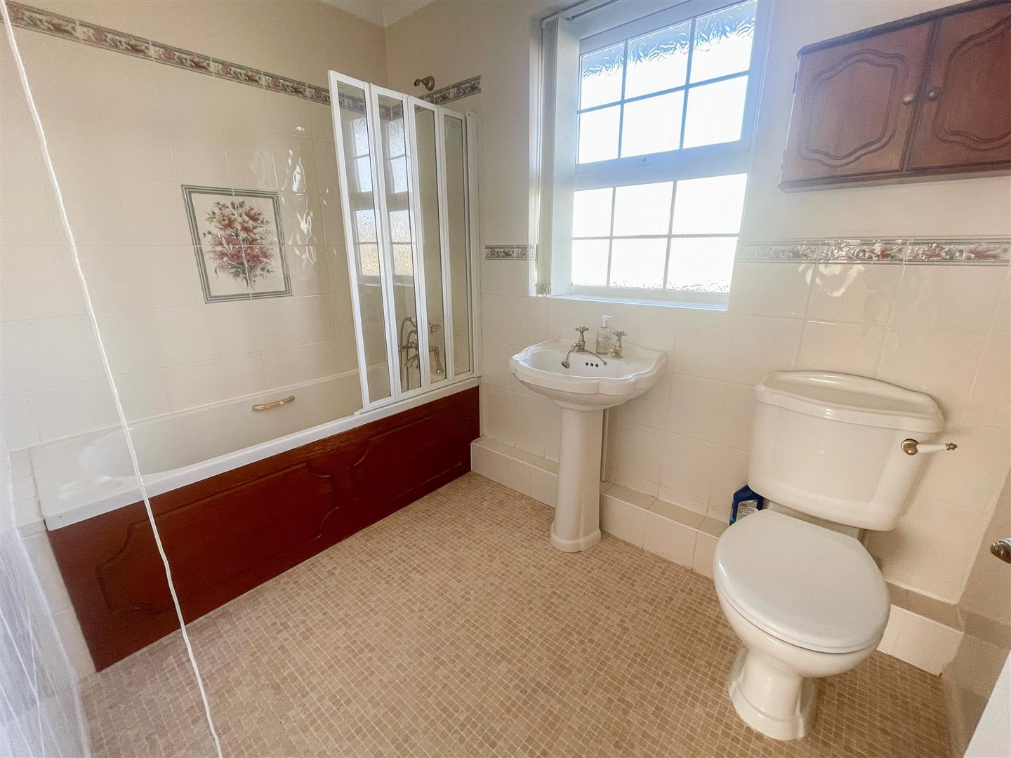 Three piece suite. Low level WC. Pedestal hand wash basin. Panel enclosed bath with wall mounted shower over. Wall mounted heated towel rail. Fully tiled walls. Double glazed frosted window to front.