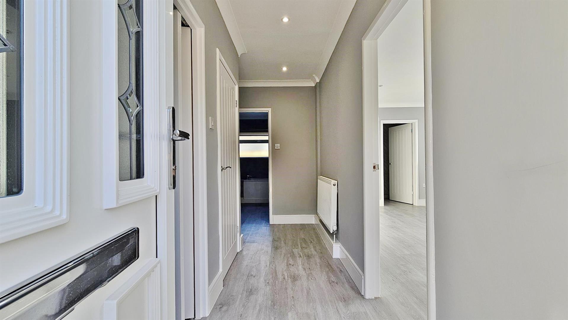 Modern white suite comprises of low level WC. Vanity wash hand basin with mixer tap and range of cupboards under. Enclosed panelled bath. Fully tiled walls. LVT flooring. Spotlights. Extractor fan. Wall mounted heated towel rail. Obscured sealed unit double glazed window to side.
