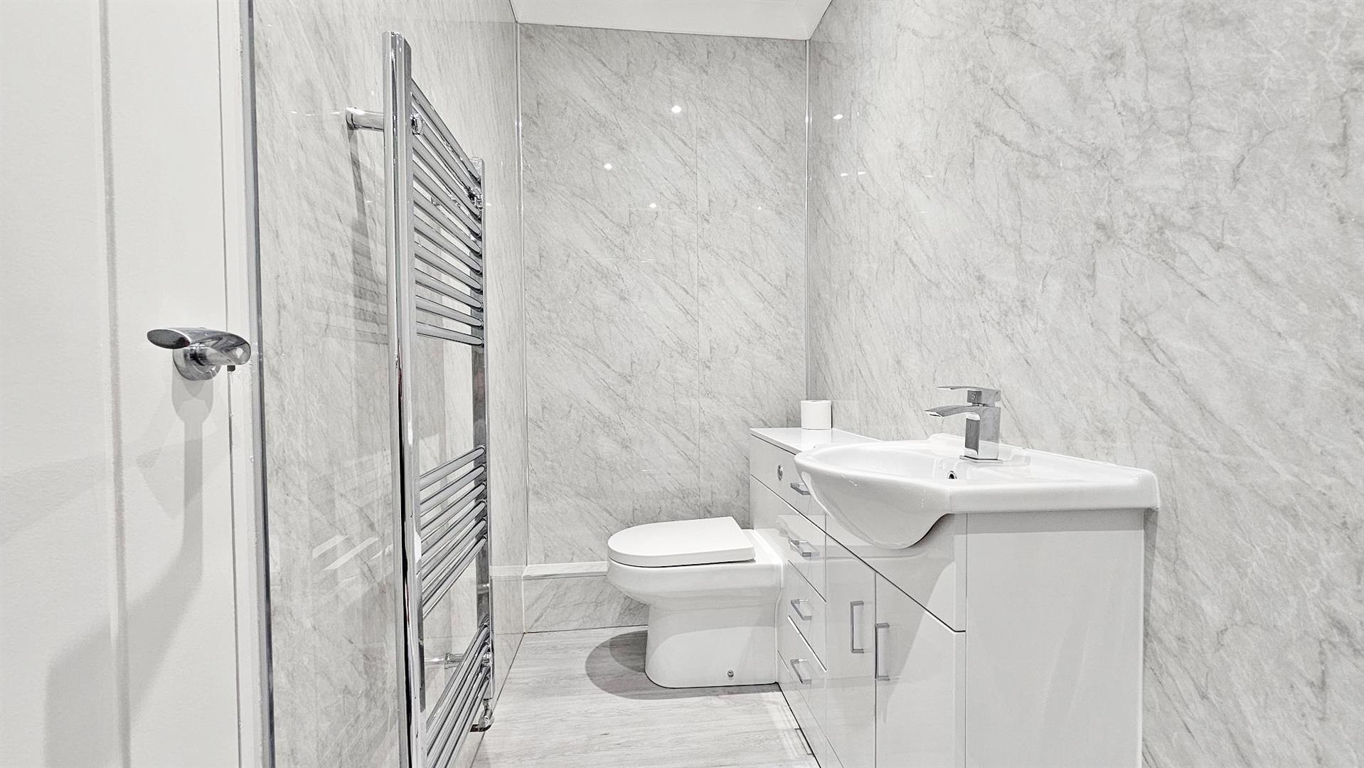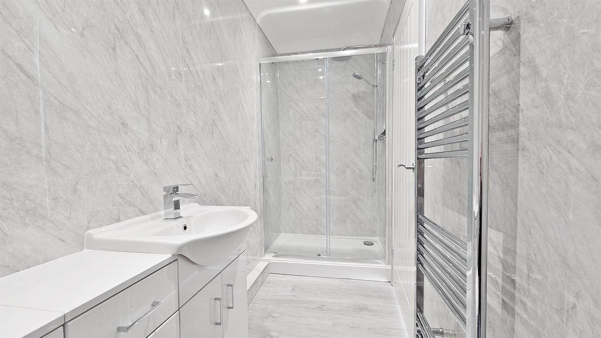 Newly installed white suite comprises of low level WC. Vanity wash hand basin with mixer tap and range of storage cupboards. Enclosed shower cubicle with wall mounted shower attachments. Fully weatherboarded. LVT flooring. Spotlights. Extractor fan. Wall mounted heated towel rail.
