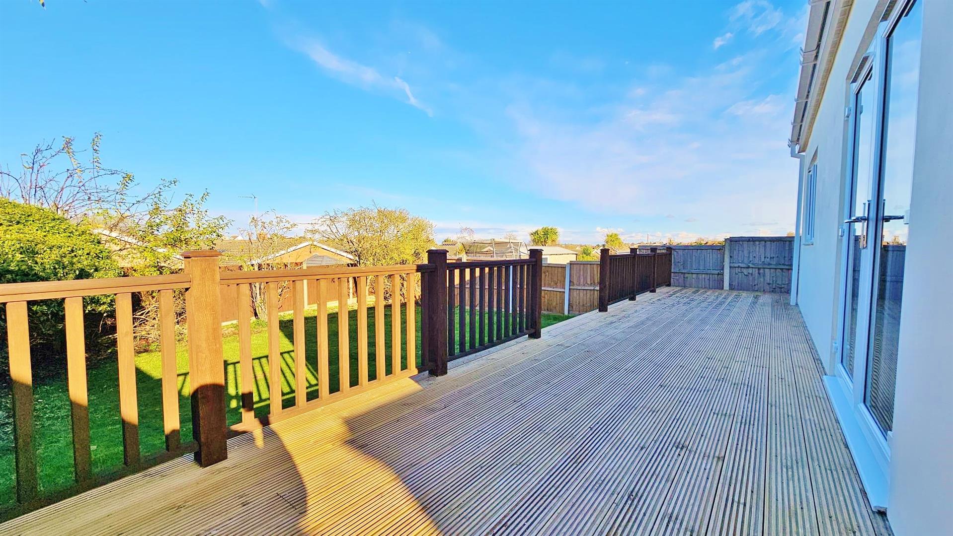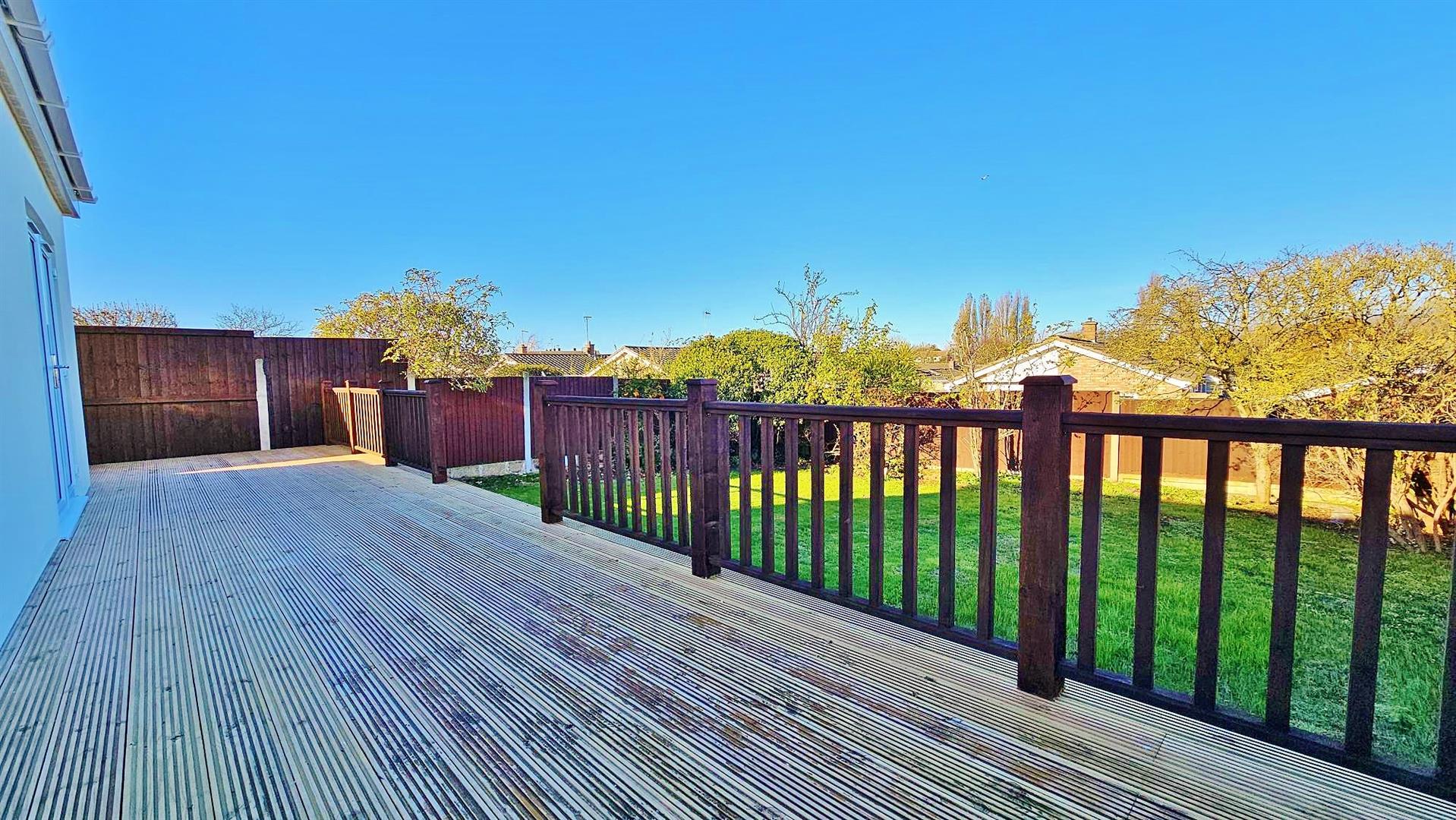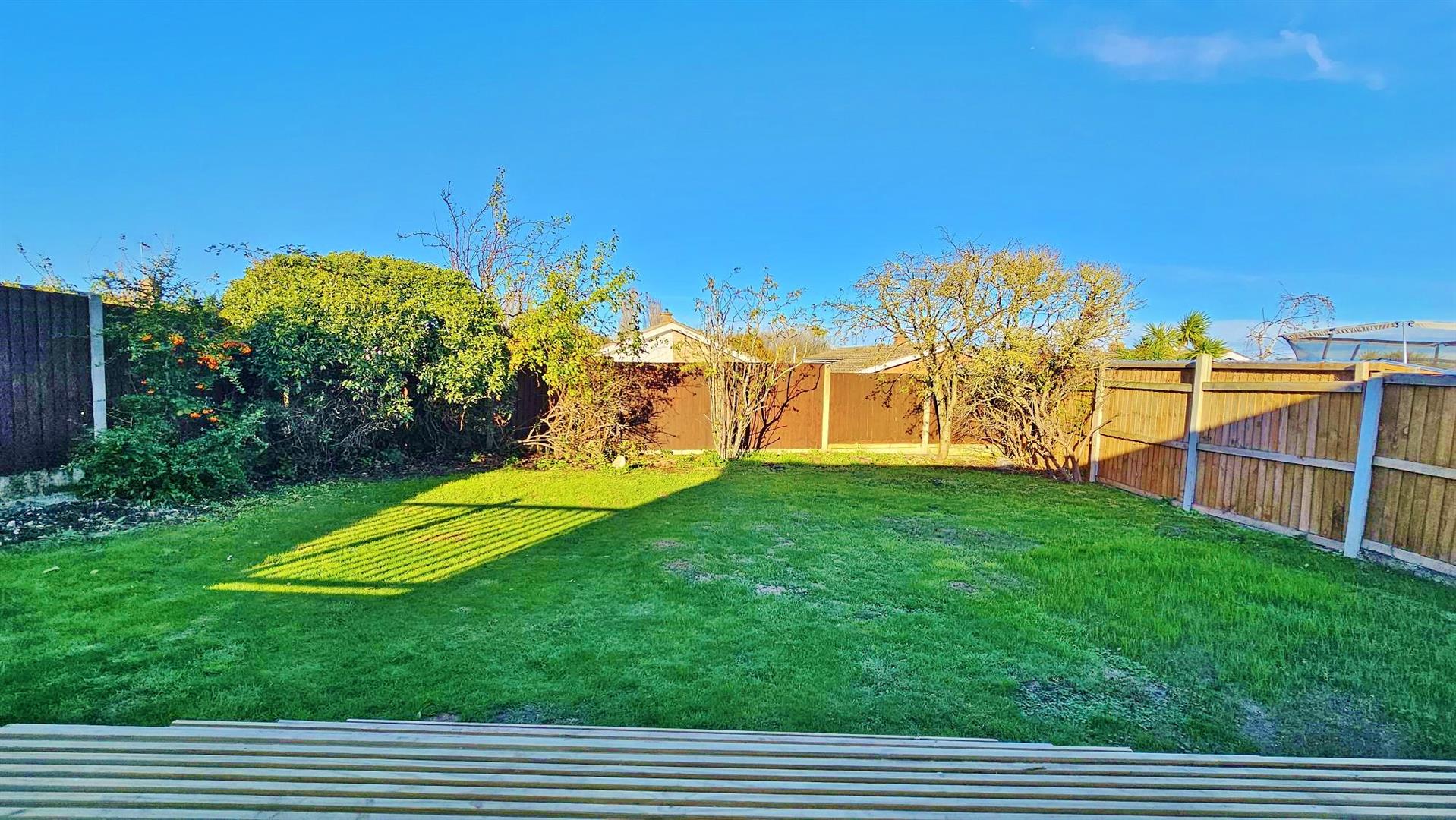 Raised wooden decking with steps leading down to lawned area. Array of trees. Access to front via side gate. Private access door to garage with power connected. Enclosed by panelled fencing.