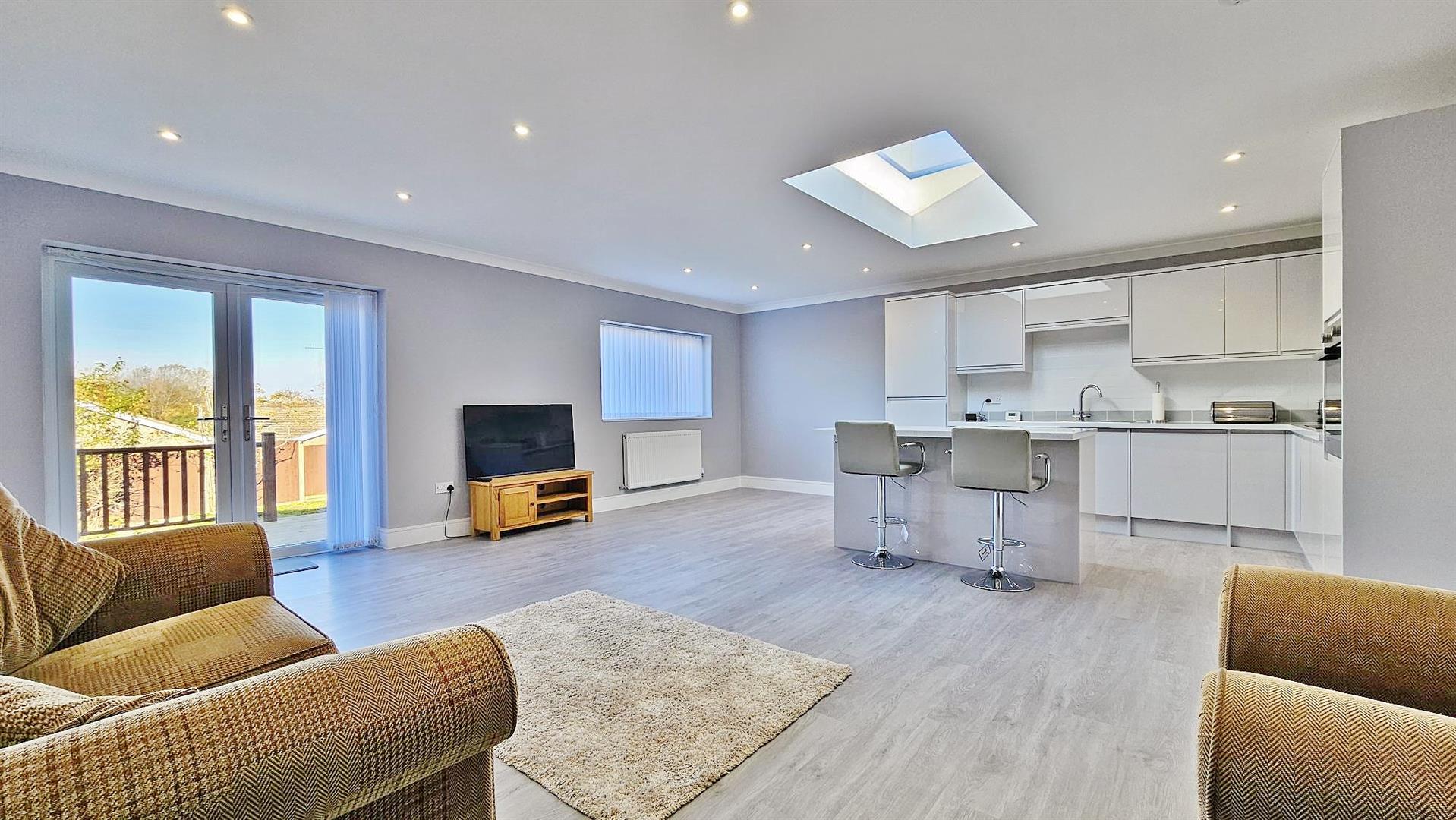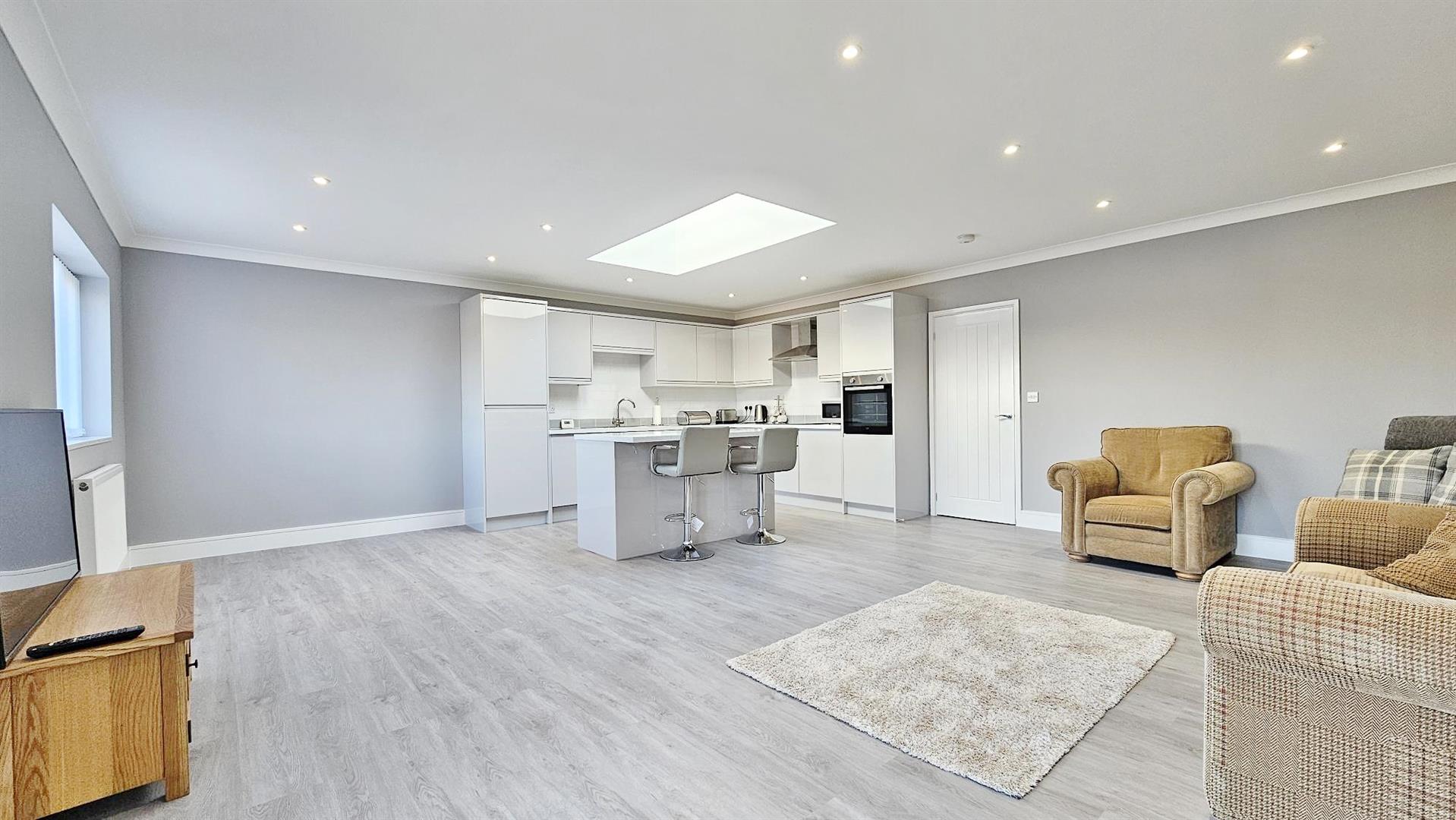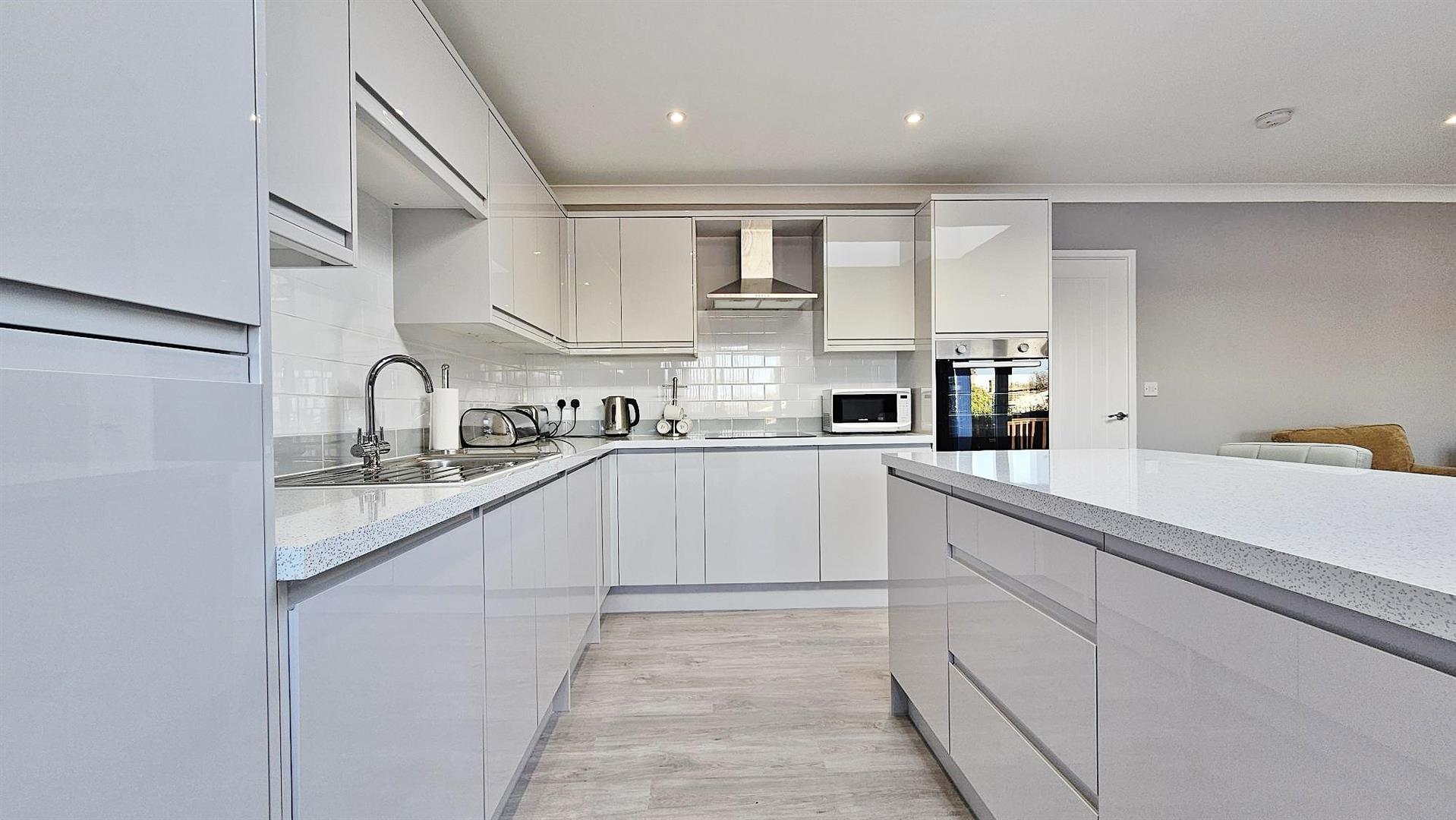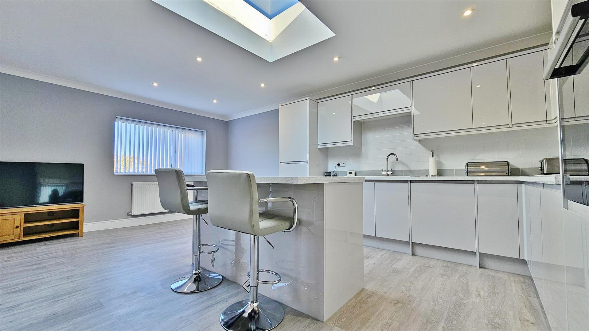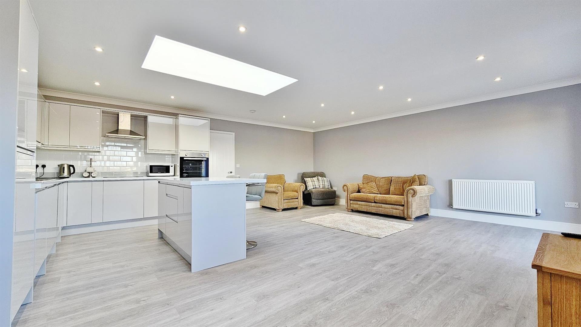 Newly insalled kitchen fitted with a range of matching high gloss fronted units. Granite effect hard edge work surfaces. Inset stainless bowl sink and drainer unit. Inset four ring electric hob with extractor hood above. Built in eye level electric oven. Further selection of matching units both at eye and floor level. Integrated fridge/freezer. Integrated dishwasher and washing machine. Central island with seating area and range of high gloss drawers and cupboards under. LVT flooring. Spotlights. Skylight. Two radiators. Sealed unit double window to rear. Sealed unit double glazed 'French' style doors leading to:.