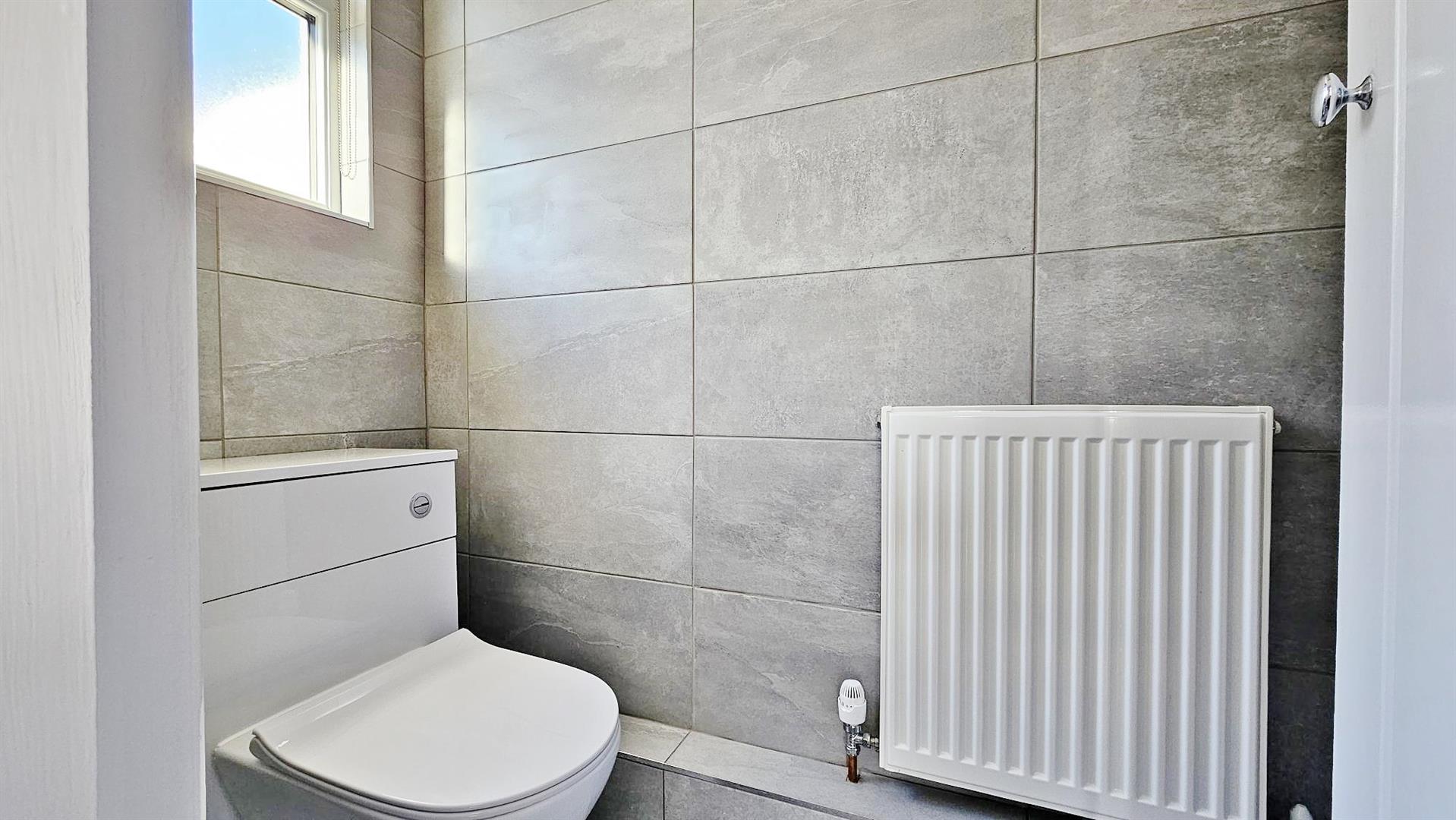 Low level WC. Vanity wash hand basin with mixer tap and cupboard under. Fully tiled walls. LVT flooring. Spotlights. Radiator. Obscured sealed unit double glazed window to side.