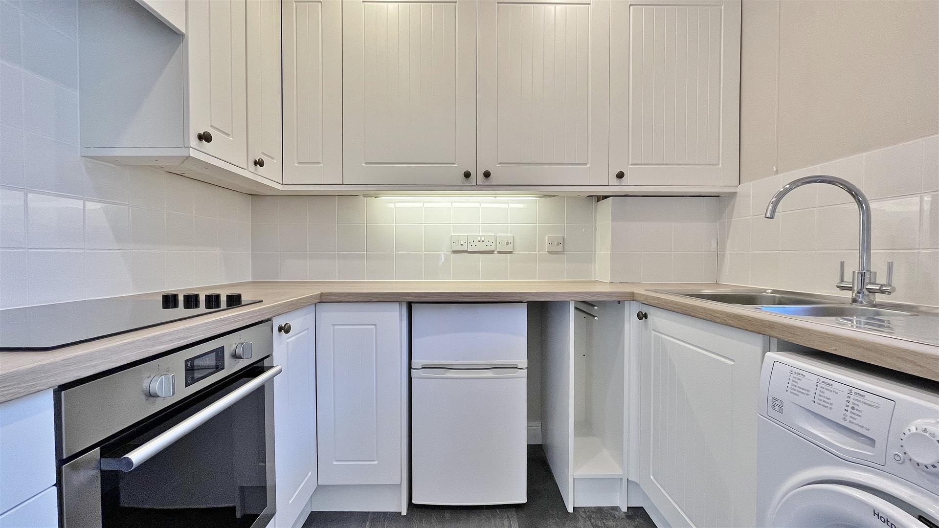 Fitted in a range of matching fronted units. Wood effect square edge work surfaces. Inset stainless steel one and a half sink bowl and drainer unit. Inset four ring electric hob with oven under and extractor hood above. Further range of matching units both eye and floor level. Space for fridge/freezer. Plumbing for washing machine. Tiled splash back. Stone effect laminate flooring. Spotlights. Sealed unit single glazed window to front.